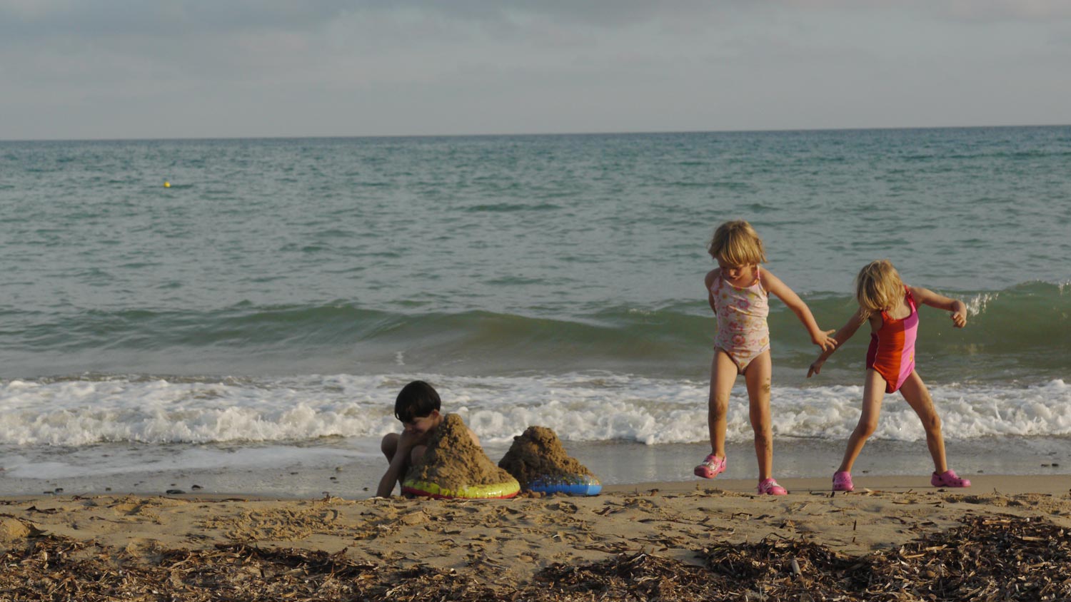 Die Spiele am Strand, wenn es zwischendurch sonnig und warm ist, ein Tag ist sogar heiß und schwül. An diesem Tag baue ich die nächste Etage des angefangenen Möbels. Adrian, der die Mädchen als Hund und Katze am Seil spazieren führt. Einer der Nachbarn macht Fotos von unseren halbnackten Kindern, Celina und ich haben kein gutes Gefühl, sagen aber nichts. Ich kann die Nachbarn – alle alt und dick – nicht auseinanderhalten, vielleicht ist es der, von dessen Frau wir Obst und Fruchtzwerge geschenkt bekommen haben. Hinter uns die Bande der deutschen Dauercamper. Überwinternde Rentnerpärchen in voluminösen Wohnmobilen, die Radio hören und laut labern. Ich gebe ihnen die Schuld dafür, dass ich mit unserem schönen Platz nicht richtig warm werde.