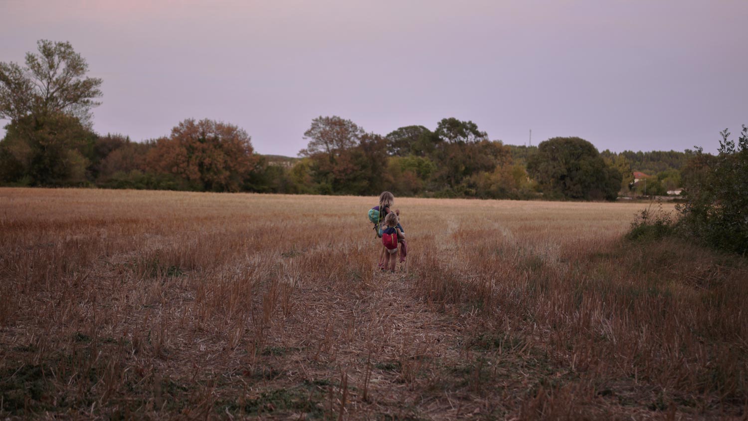 Fertige Galettes aus dem Kühlregal, in der Pfanne kommt Spiegelei und Reibekäse drauf. Zusammenfalten, knusprig, fertig. Dazu Salat. Alle sind begeistert. Die Kinder, mit letzter Kraft bettfertig gemacht, lassen sich nicht ins Bett bringen, sondern packen ihre Rucksäckchen für eine Wanderung. Eigentlich eine gute Idee, wir fügen uns. Sie marschieren vollbepackt los übers Stoppelfeld, Toni erfindet die passende Geschichte, wer da wohin wandert und warum, Peppi zieht bereitwillig mit. Volker und ich sitzen vor dem Düdo, genießen den Moment kostbarer Ruhe. Bei uns ist die Sonne schon untergegangen, aber es sieht aus, als tauche sie dort, wo unsere Kinder hinstreben, das Stoppelfeld noch in rotgoldenes Licht. Eine Fata Morgana? Irgendwann weint Peppi herzzerreißend auf, schrille Klagelaute dringen übers Feld. Ich renne los, ist sie gefallen, hat sie ein Insekt gestochen? Es ist das Bonbon, das Toni im großen Rucksack gefunden hat, ein einziges. Ich schlage vor, das Bonbon zu teilen, Toni ist einverstanden, Peppi hört auf zu weinen. Puh.