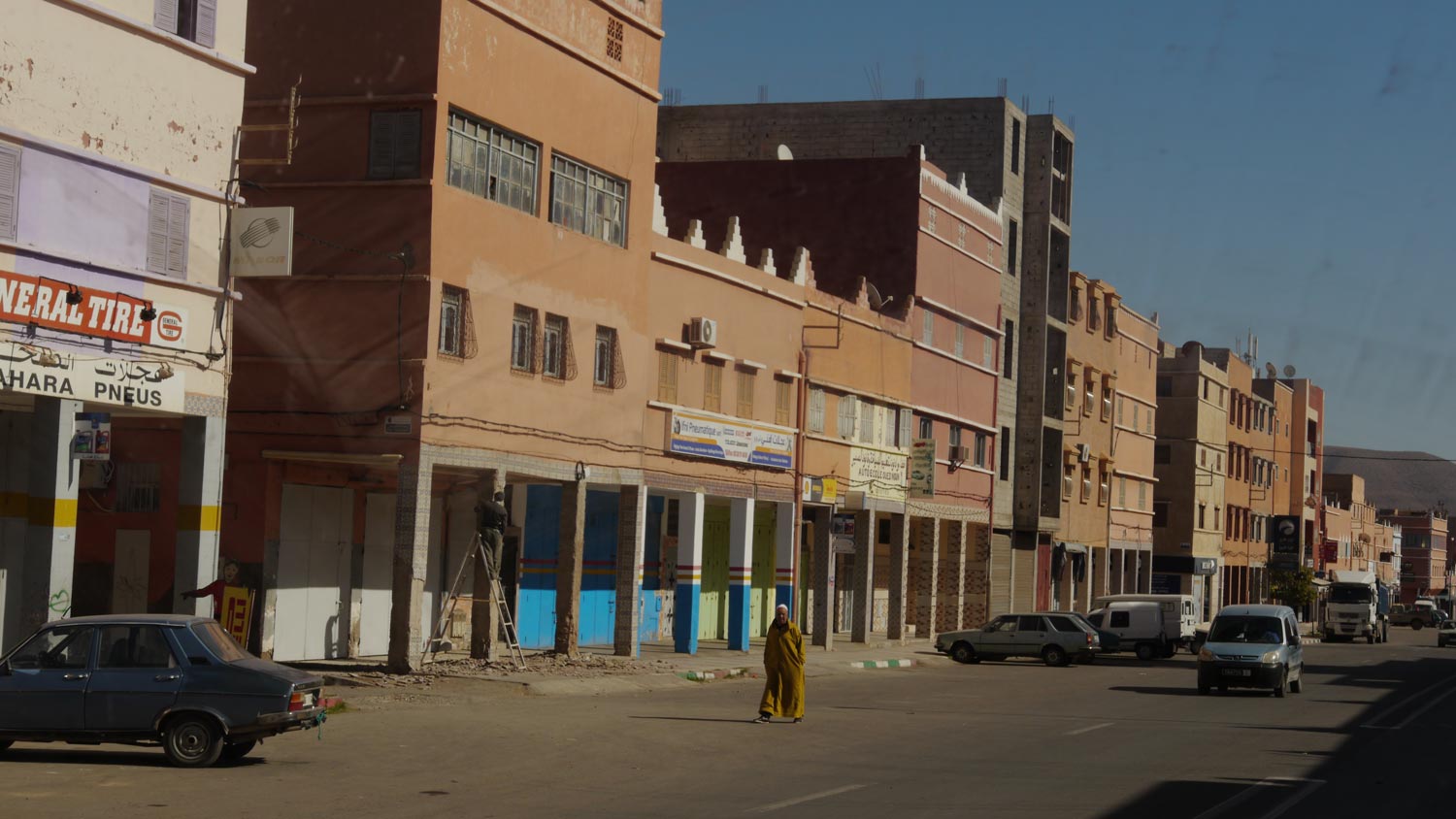 Dem Gesetz unserer Reise folgend, dass es alles im Überfluss gibt, außer man sucht danach, haben alle Kioske mit dem blau-orangenen Maroc-Telecom-Schild gerade zu. Ein Telefonladen hat offen, aber der nette Verkäufer bedeutet mir, dass er keine Guthaben-Karten verkauft, sondern mir das Guthaben schicken könnte, aber dafür müsste ich meine Telefonnummer kennen, und das tue ich immer noch nicht. Also weiter. Aber wir finden nichts und kehren deshalb am Kreisverkehr um, zurück zu dem Telefon-Mann, ich kann ihn ja auf meinem Handy anrufen, so hätte er meine Nummer. Auf dem Weg sehen wir doch einen offenen Kiosk mit Maroc-Telecom-Schild, Volker bremst, ich springe raus, aber er hat keine Karte. Schickt mich nach nebenan. Der nebenan schickt mich nach gegenüber. Und da kriege ich dann eine. Kaufe auf dem Rückweg noch Brote, wieder ein außergewöhnlich herzlicher Verkäufer – Bienvenue en Maroc – dann zurück zum Düdo und zurück zur Oase.