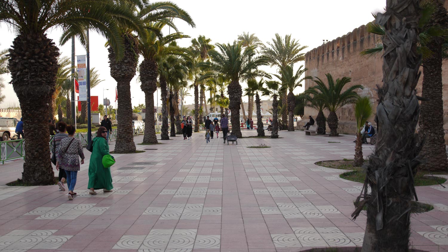 In Taroudannt ist es nochmal wärmer als überall wo wir bisher waren. Also in Zagora war es auch heiß, aber nur in der Sonne, die Luft selbst war frisch, was man daran merkte, dass man im Schatten sofort fröstelte. Hier plötzlich richtiger Sommer, warme Luft zum Reinkuscheln, die Nähe des Meeres. Auf dem Weg in die Stadt machen wir Halt an einem Spielplatz, wir scherzen: Der größte von ganz Nordafrika. Als wir draufstehen, merken wir: Es gibt zwar jede Menge Spielgeräte, aber es sind immer die selben: Mini-Rutschen, Schaukeln, und Wipp-Tiere. Gut für uns, Toni und Peppi sind, trotz wochenlanger Spielplatz-Abstinenz, bald mit allem fertig und wir können weiter. Alle sind hungrig.