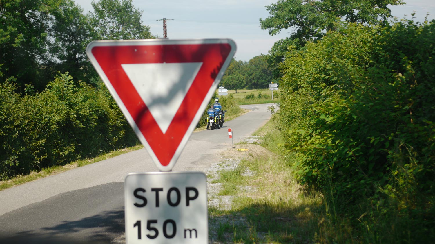 Wir rollen weiter, halten einen halben Kilometer später in einer regulären Parkbucht am Straßenrand. Da biegen von der Hauptstraße her zwei Polizisten auf zwei Motorrädern ein, halten in hundert Metern Entfernung und gucken unauffällig in unsere Richtung. An ihren Hüften baumeln Maschinenpistolen. Wir können uns kaum vorstellen, dass sie wegen uns hier sind, haben aber so recht auch keine andere Erklärung. Sehen wir aus wie Terrorverdächtige? Volker und ich witzeln, aber Toni verkriecht sich vor Angst fast unter dem Tisch. Ich nehme Peppi auf den Arm – seht, wir sind eine harmlose Familie mit Kleinkindern – und schlendere einmal um den Düdo herum. Toni fleht uns an, weiter zu fahren. Aber Volker muss jetzt endlich sein Telefonat führen. Ich versuche Toni davon zu überzeugen, dass uns die Polizisten nichts tun werden. Erfolglos.