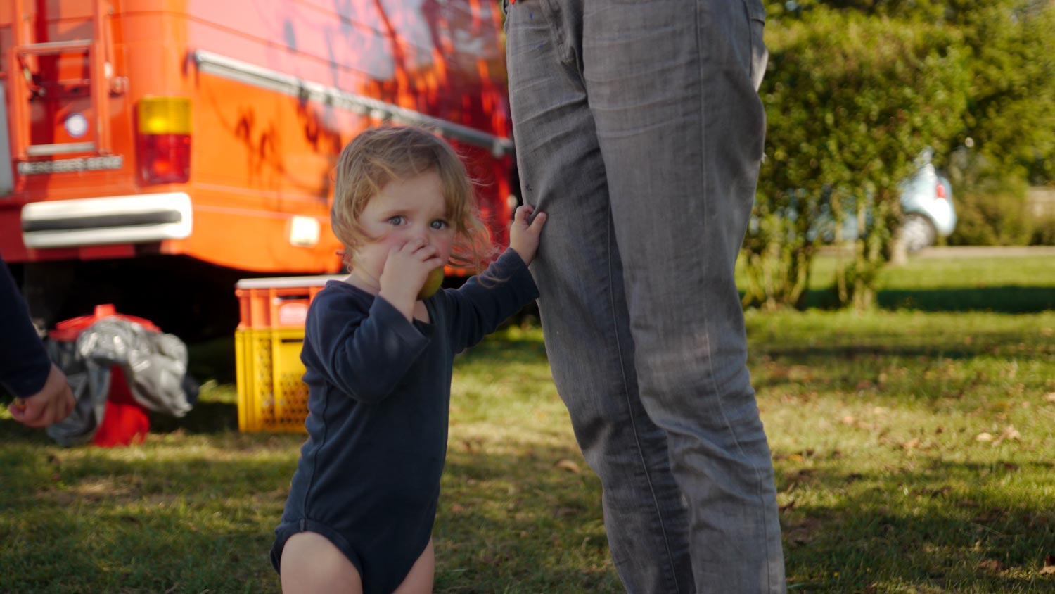 Danach wieder abspülen. Ich bin mittlerweile tollkühner geworden und nehme einen winzigen Tropfen Spüli, obwohl wir keinen Abwassertank haben und ja alles auf die Wiese kippen müssen. Laut den Statuten von France Passion dürften wir aus dem Grund gar nicht mitmachen, weil wir nicht komplett autark sind wie die anderen Wohnmobile, die wir sehen, was man daran merkt, dass man nur die Wohnmobile sieht, und nie die Menschen darin, weil sie eben alles drin machen, während wir alles draußen machen, außer Schlafen. Dann aufräumen, die Kinder, es ist eine ständige Plackerei, aber es fühlt sich nicht an wie Plackerei, weil es immer wo anders ist.