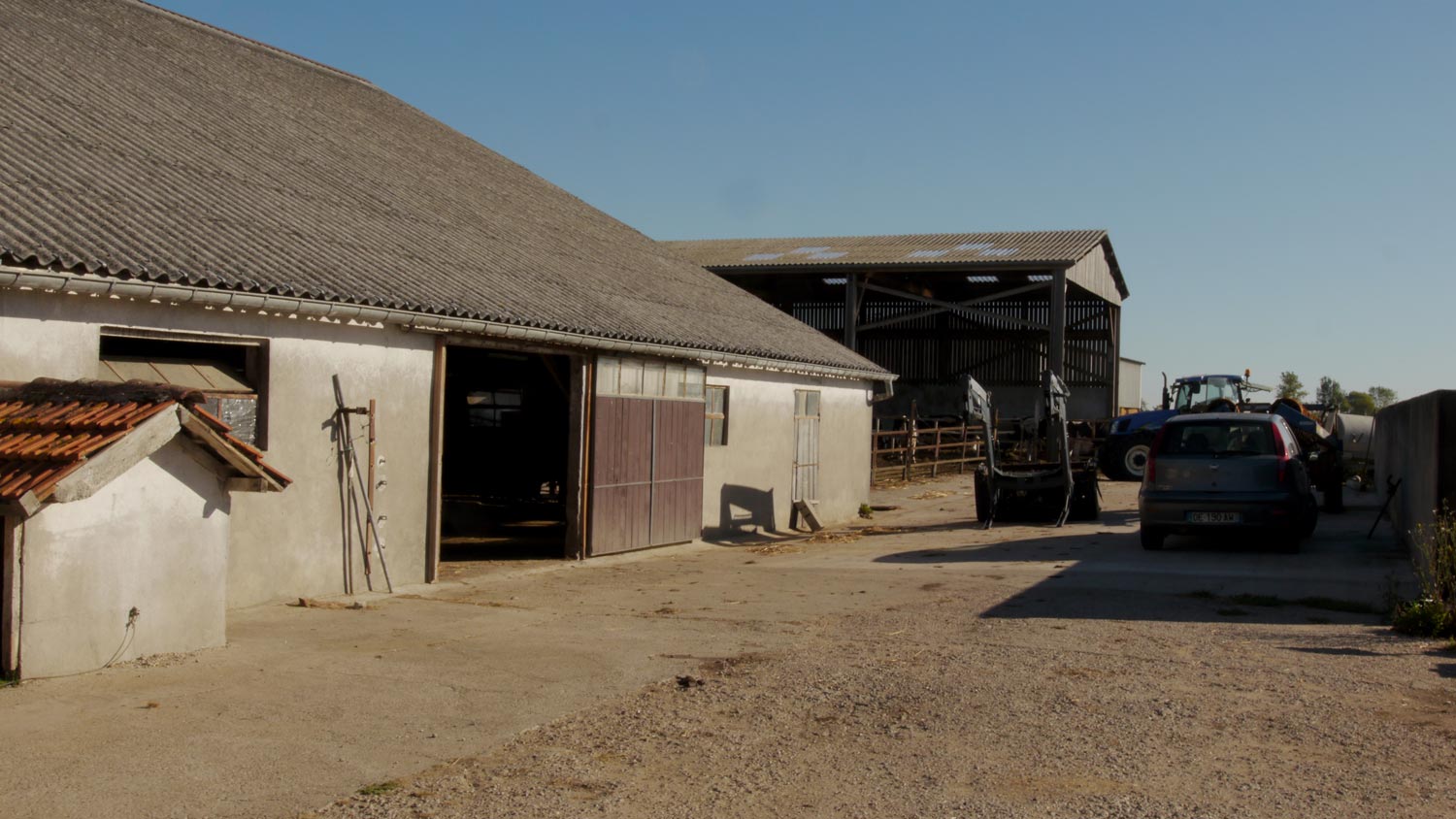 Der Bauernhof ist ganz anders als die Forellen-Farm. Die war so weit unten im kühlen Wald, irgendwie abgelegen und verwunschen. Hier hört man die Autobahn, es ist trotzdem abgelegen und ländlich, aber eher oben, auf einem Hügel, um uns herum weiter Blick. Wir stehen nah am Haus des Bauern. Katharina ist klug und bleibt drin. Hunde, Katzen, Kätzchen, alles schon da. Ihre Wunde ist fast völlig geheilt. Der Bauer ist sehr nett, zeigt Volker und den Kindern den Stall und die Kälbchen, Peppi hat Angst vor den Kälbchen. Sie sagt zum ersten Mal das Wort. „Angscht.“