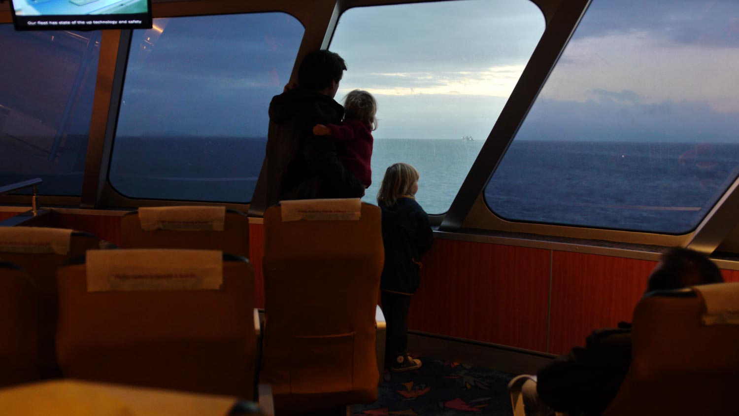 Wir verschlafen, aber zum Glück merkt Volker es rechtzeitig. Fahren mit im Bett schlafenden Kindern los, sind kurz nach sieben bei der Fähre. Ein hysterisch winkender Spanier hält uns auf, schnell und hektisch: Wollt ihr sofort auf die Fähre? Dann müsst ihr noch 20 Euro mehr zahlen. Wir haben doch schon Tickets! Er faselt, dass die Fähre ausfällt, wegen einer Baustelle, wir müssten eine andere nehmen, und die sei 20 Euro teurer. Ich bin noch im Schlafanzug. Wir fahren weiter, stellen uns in die Schlange von unserem Schalter, er kommt wieder ans Fenster, aufgeregt, STRESS! Ich ziehe mich hinter dem Vorhang an, zeige ihm unser Ticket, unvorsichtig, unvorsichtig, er nimmt es mir aus der Hand, blättert unkoordiniert, schaut sich die Rückfahrt-Tickets an, erkennt offenbar nicht, dass es die Rückfahrtickets sind, daran erkenne ich jetzt endlich definitiv, dass dies hier kein Hafenmitarbeiter ist. Zum Glück gibt er mir das Ticket zurück.