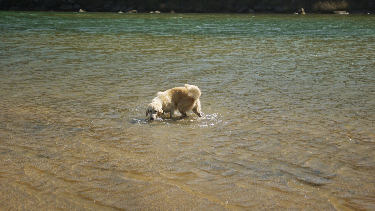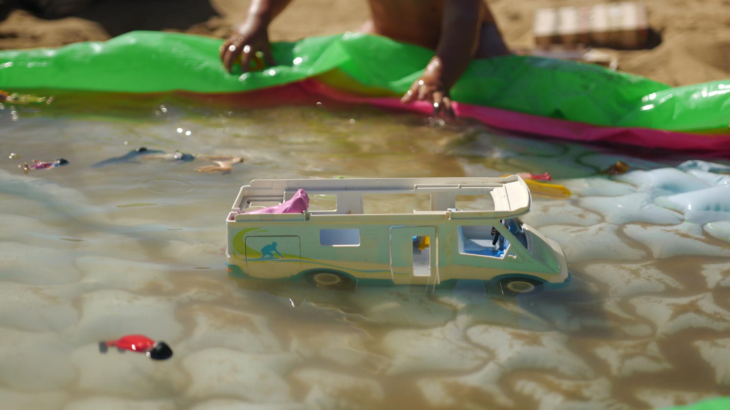 Am Fuße eines tiefgrün bewaldeten Hügels fließt der Fluss gen Meer, breit, flach und türkis. Aber das stimmt gar nicht. Der Fluss fließt gerade in Richtung Quelle, denn die Flut drückt Salzwasser ins Landesinnere. Die Kinder entdecken ein kaputtes Planschbecken im Schilf, zum Glück gleichzeitig, so gehört es allen. Dass es kaputt ist, vermuten natürlich nur wir Erwachsenen. Zu unrecht: Der Boden ist intakt, eine der drei Wandwürste hält auch die Luft. Man kann also etwas Wasser einfüllen, das sich in der Sonne erwärmt. Jaccuzzi.