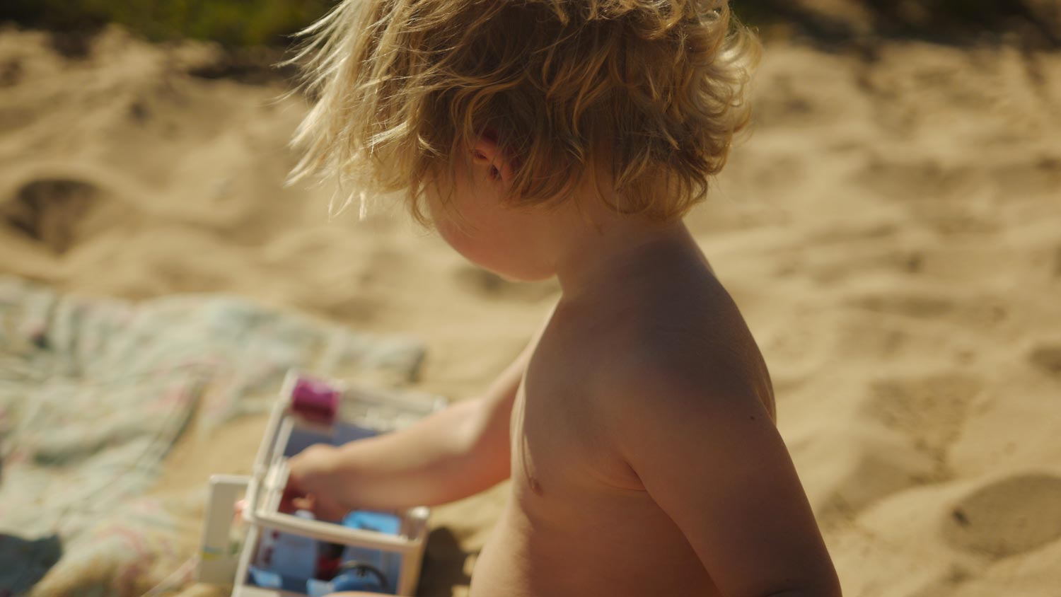 Peppi will sich abtrocknen, aber ich habe kein Handtuch dabei. „Vielleicht die Nele“, sagt Peppi, und findet in deren großer Rossmann-Umhängetasche tatsächlich eins. Wir sind in den drei Wochen gemeinsamen Strandlebens schon ziemlich vertraut geworden. (Jetzt, am letzten Tag, nimmt Volker, erklärter THC-Verächter, sogar einen Zug vom Joint der beiden und legt sich danach erstmal eine Runde in den Düdo.) Peppi spielt im Sand mit dem Playmobil-Wohnmobil von Sati, hält inne und sagt: „Kai?“. Kai antwortet: „Peppi?“. Peppi seufzt selig und spielt weiter.