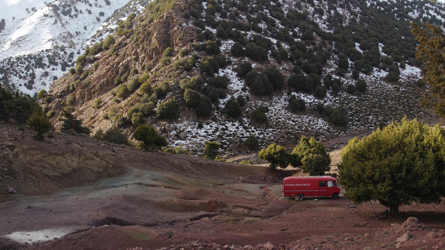 Mehrmaliges Wenden in Ouirgane, wir denken erst, wir hätten den Abzweig zum empfohlenen Stellplatz übersehen, dabei waren wir noch gar nicht so weit. Wir entscheiden uns für ein riesiges Schotterfeld mit spektakulärem Ausblick auf ausgewaschene, rote Felswände, die der Atlas uns hier präsentiert.
