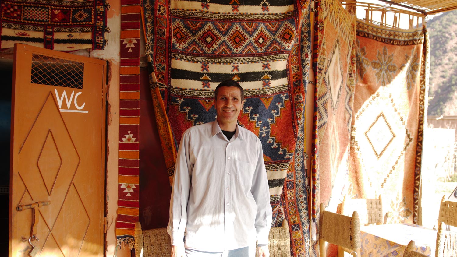 Nach diesem geheimtipplerischen touristischen Höhepunkt – es ist tatsächlich das erste kulturelle Sightseeing unserer Reise – fühlen wir uns wie im Urlaub. Wir haben es nicht eilig, Marrakesch ist in kalkulierbarer Nähe und der Flug erst in drei Tagen. Wir schlendern zu dem Café/Teppichladen, dessen Besitzer uns schon beim Vorbeifahren vorhin aufgeregt zugewunken hat, wahrscheinlich kommt hier pro Tag höchstens ein potentieller Gast vorbei.