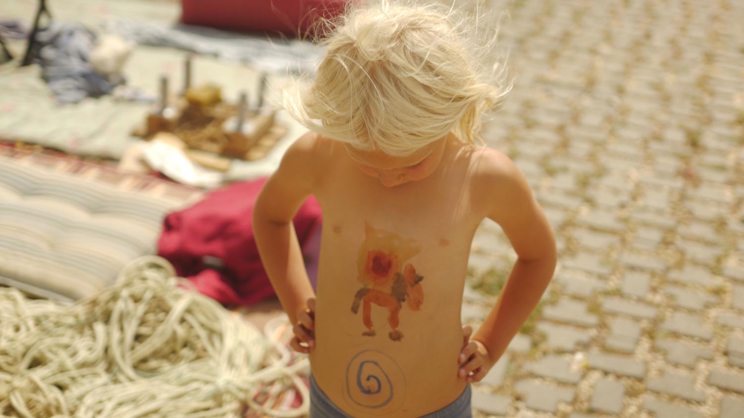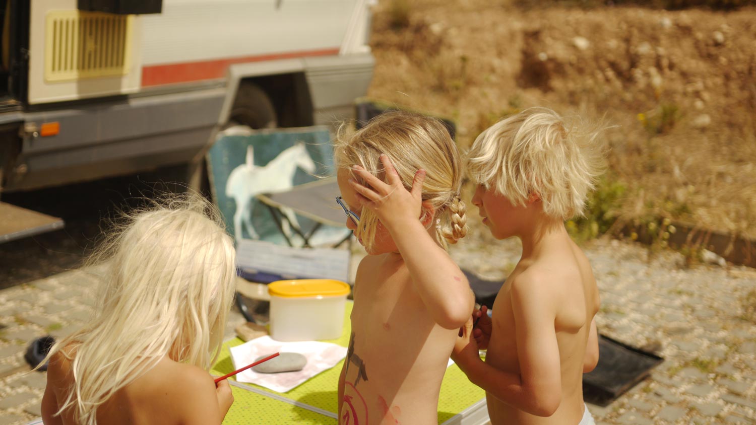 Toni und Marta finden zusammen, ich freue mich. Simon und Sati sind ja beide schon sechs, Toni kommt beim Spielen manchmal nicht hinterher. Oder die beiden Großen wollen für sich sein. Marta ist drei, endlich kann Toni mal bestimmen. Die beiden schleppen zusammen riesige Steine über den Strand. Ein nackter Mann übt Handstand.