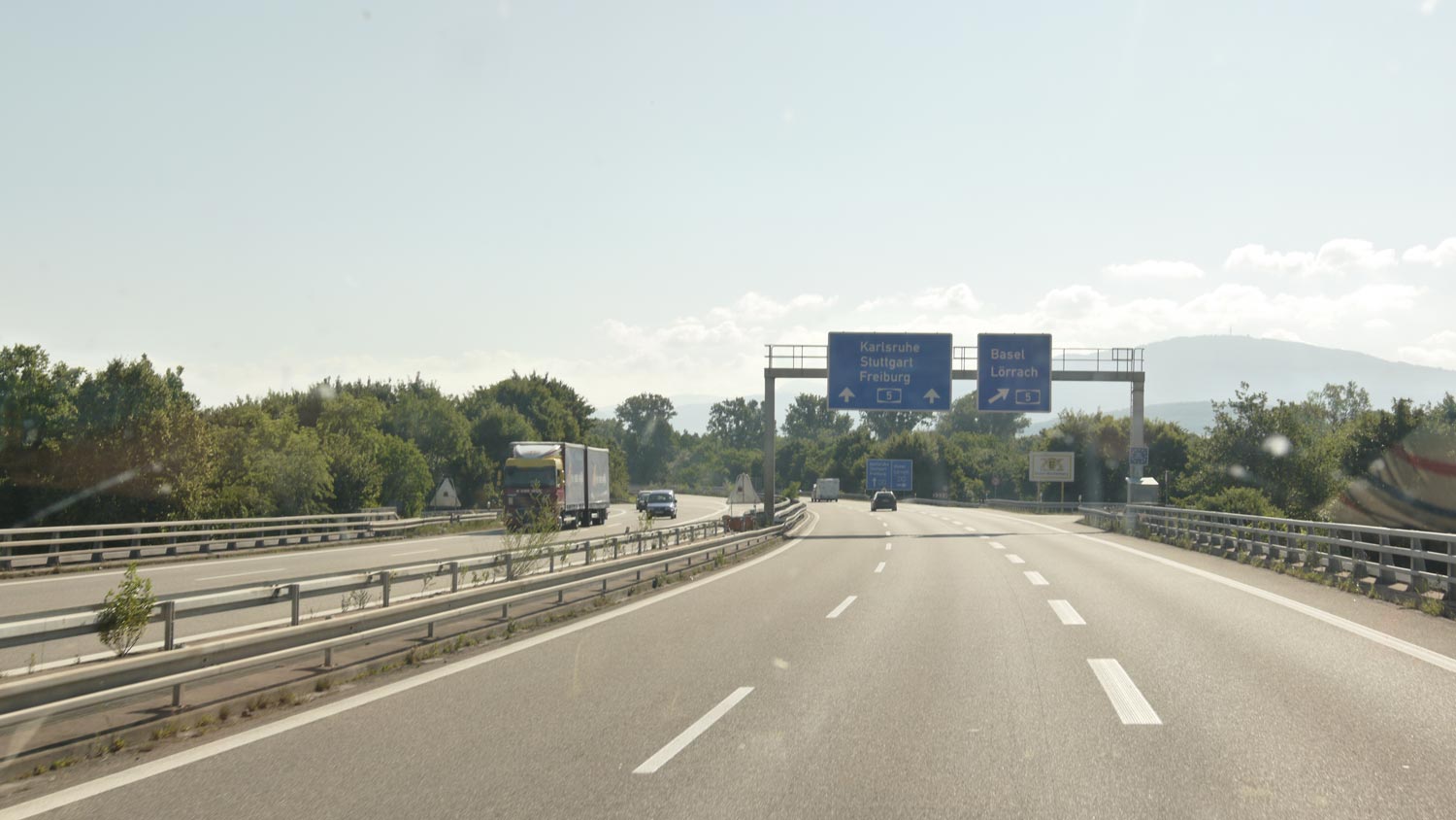Zwischen den Trucks, mit denen wir den Schlafplatz geteilt haben, kommt uns der Düdo ganz klein und zerquetschlich vor. Die Grenze ist wieder so unsichtbar wie gewohnt. Plötzlich sind wir in Deutschland. Hübsch, hier unten.