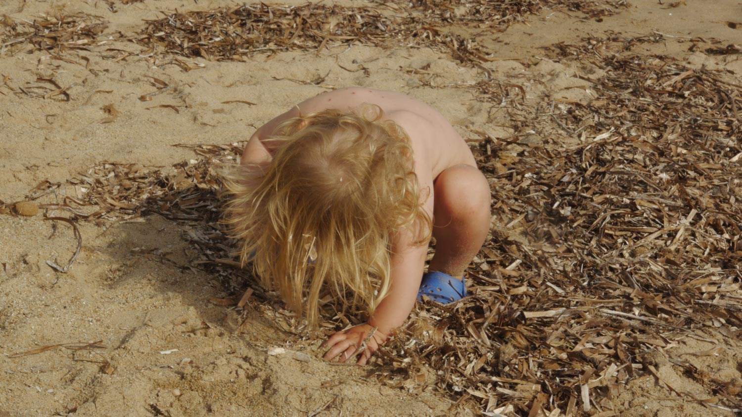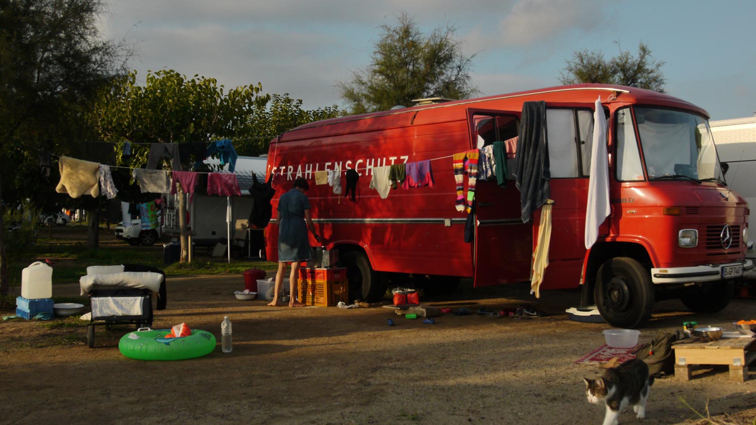 Die Spiele am Strand, wenn es zwischendurch sonnig und warm ist, ein Tag ist sogar heiß und schwül. An diesem Tag baue ich die nächste Etage des angefangenen Möbels. Adrian, der die Mädchen als Hund und Katze am Seil spazieren führt. Einer der Nachbarn macht Fotos von unseren halbnackten Kindern, Celina und ich haben kein gutes Gefühl, sagen aber nichts. Ich kann die Nachbarn – alle alt und dick – nicht auseinanderhalten, vielleicht ist es der, von dessen Frau wir Obst und Fruchtzwerge geschenkt bekommen haben. Hinter uns die Bande der deutschen Dauercamper. Überwinternde Rentnerpärchen in voluminösen Wohnmobilen, die Radio hören und laut labern. Ich gebe ihnen die Schuld dafür, dass ich mit unserem schönen Platz nicht richtig warm werde.