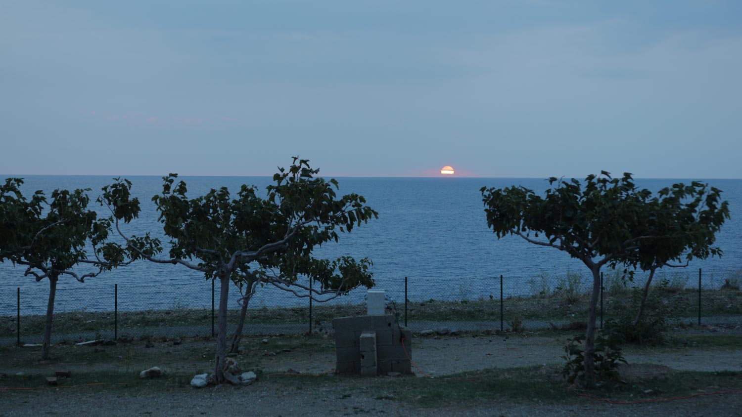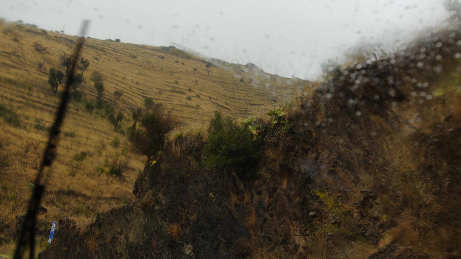 Das Ding hier ist ein Skulpturenpark, weiter oben ist ein Restaurant, oder Bar oder so was. Später wandere ich mit Peppi hoch, Jazz-Klavier, vom Band oder live? Nur ein Auto steht auf dem Parkplatz, auch ein hippieskes Fahrzeug. Ich koche drin, es geht wahnsinnig schnell mit dem Camping-Kocher. Von den nassen Sachen und vom Wasserdampf ist alles nass. An der Decke bilden sich Tröpfchenfelder. Der Düdo-Himmel ist komplett beschlagen.