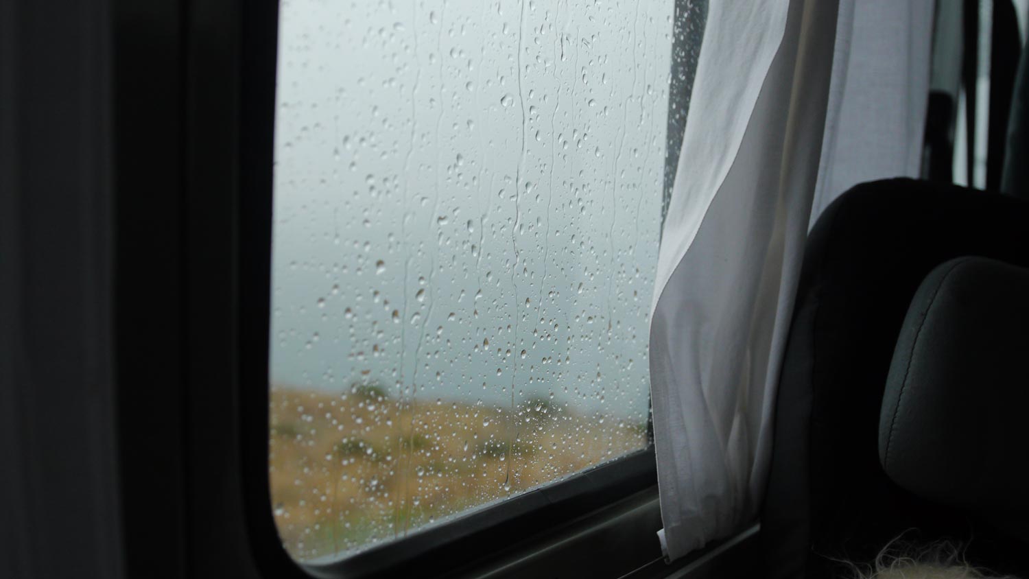 Am nächsten Tag dann in der Früh ab Richtung Spanien, Frühstück beim Leuchtturm, dann fängt es an zu schütten. Der Regen trommelt so stark aufs Düdo-Dach, dass ich ein Sprachmemo davon aufnehme. Es donnert auch und blitzt, warum ein Gewitter, welchen Temperatursturz soll es denn geben, es ist doch schon kalt. Das Frühstücksgeschirr lassen wir im Regen stehen, damit es sauber wird. Klappt so mäßig. Nach zwei Stunden lässt der Regen nach, wir fahren weiter, Richtung Spanien.