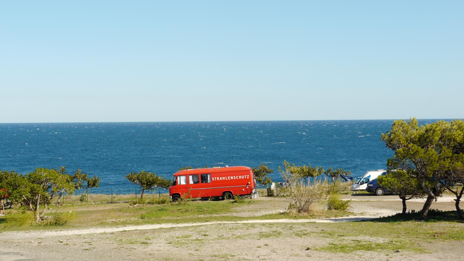 Wir prellen die Zeche der letzten Nacht und ziehen um an den Strand unterhalb des Sanatoriums / Reha-Zentrums. Da ist ein Parkplatz mit einem Schild, auf dem ein Wohnwagen zu sehen ist und Reglementé steht. Mittags Einkaufsausflug nach Banyuls-sur-Mer, als wir beim Supermarkt ankommen, merken wir, dass er zu hat, Mittagspause. Wir parken den Düdo an der steilen Ausfahrtsstraße oberhalb des Meeres, eine Frau schenkt uns ihren Parkschein mit dem wir noch bis vier hier stehen dürfen. Peppi schläft, ich gehe mit Toni runter zum Strand, Lotta vorlesen, Karotten essen. In der Sonne bretzelt es zu sehr, im Schatten ist es zu kalt, wegen Wind. Toni hat die fantastische blaue Giants-Schirmmütze auf, die ihr so gut steht. Argelès ist angeblich, laut Werbung vom Hypermarché, nur 15 Minuten entfernt. 15 Autominuten = 50 Düdominuten.