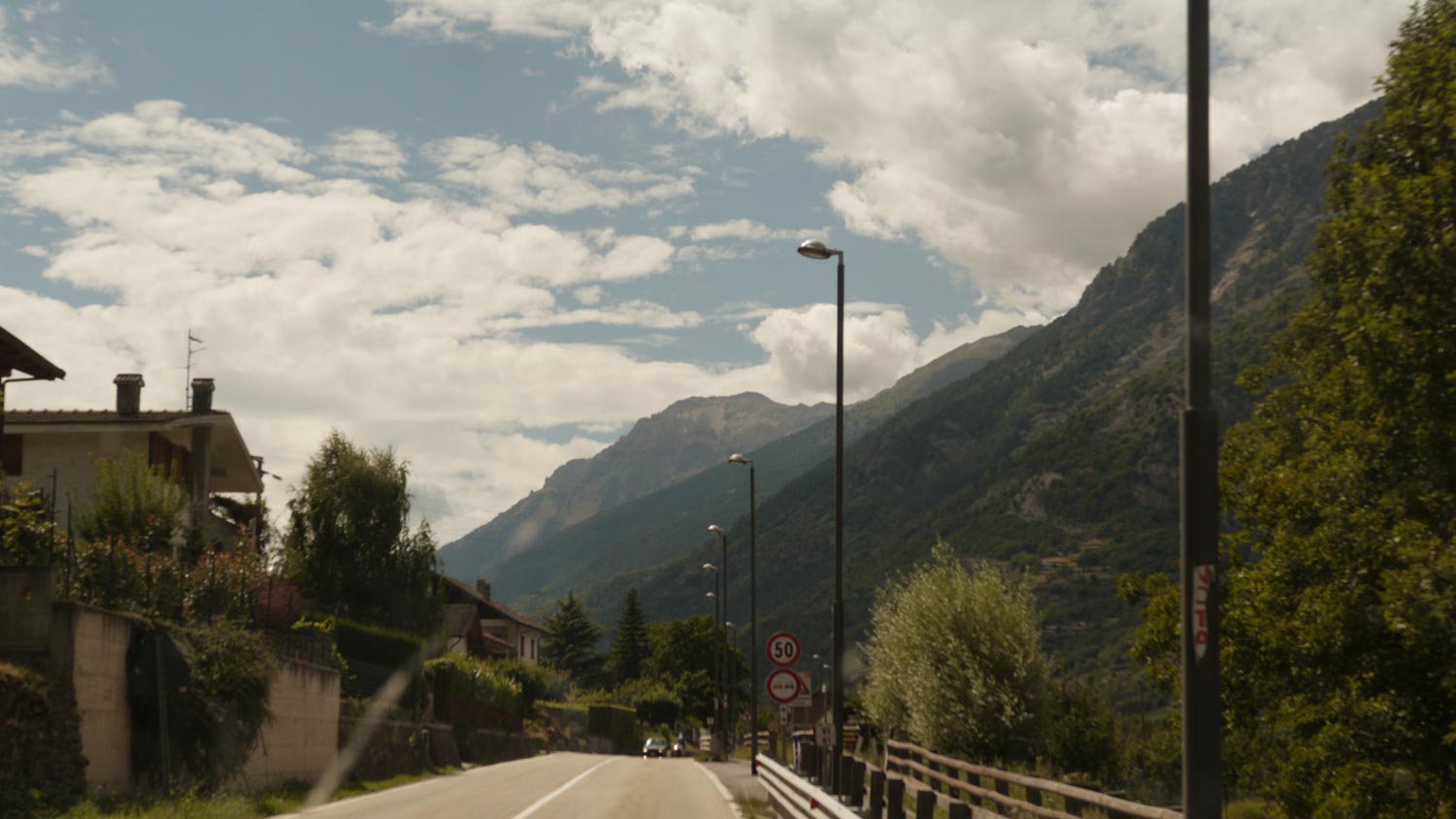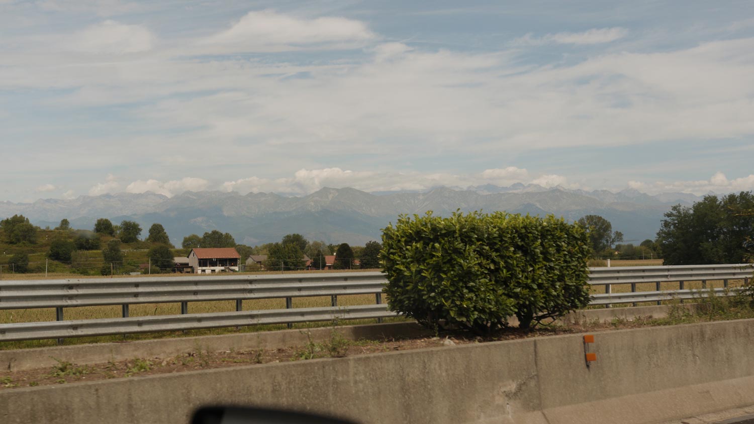 Wir halten – schon wieder – auf die Alpen zu. Sind das wirklich alles die Alpen? Jener ganze Gebirgsriegel, der sich in weitem Bogen von Österreich über die Schweiz, Deutschland, Italien, Frankreich, bis ans Mittelmeer spannt? Wohl schon. Es ist warm und diesig, ohne Sonne, ich fühle mich unverschwitzt trocken, sogar sauber, obwohl die letzte Dusche in Böblingen war. Es ist schön, sonntags unterwegs zu sein. Verschlafene Straßendörfer, ein Dentista mit verrammeltem Schaufenster. Nur Stände mit buntem Obst haben offen.