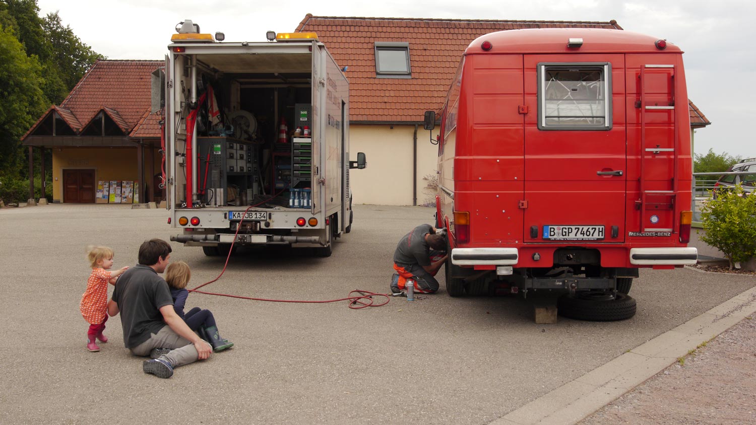 Oben am Abgrund knallrot der Düdo gegen den dunkelgrünen Wald. Wir kommen ganz beseelt von unserem Ausflug zurück, hat eineinhalb Stunden gedauert. Genauso leicht hab ich mir das ausgemalt. Dann kommt – fast pünktlich – der Pannenmensch. Ein sportlicher, tätowierter Mensch mit höchstwahrscheinlich Karlsruher Dialekt. Ist aus Deutschland rübergedüst, wir sind ja noch nicht weit gekommen. Er geht sofort ans Werk, superschnell. Bremsen-Reiniger auf die ja seit Jahren nicht bewegten Schrauben. Trotzdem kriegt er sie selbst mit seinem Pressluft-Akku-Schrauber nicht auf, sondern nimmt einen herkömmlichen Ringschlüssel und steckt ein Rohr drauf. Damit geht es. Denke an meinen Vater, der irgendwen zitiert, sinngemäß: Gib mir einen lang genugen Hebel und ich wälze die Welt vom Sockel. Ich schaue genau zu, um mir zu merken wie er das macht, also der Pannenmensch, so einen Reifen wechseln. Es ist kein Hexenwerk, wir hätten es auch geschafft, aber wir hätten bestimmt einen Tag gebraucht.