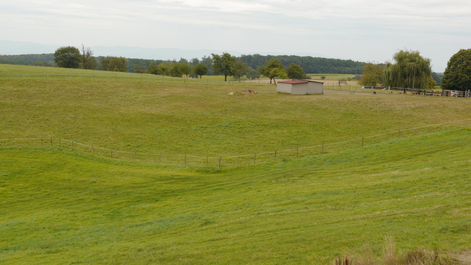 Toni will sich keine Regensachen anziehen, es tröpfelt auch nur noch. Ist mir recht. Wir laufen den Abhang hinunter zu den Pferden (Amadeus und Sabrina). Toni will den Pferden Gras geben, lässt den Büschel aber immer zu früh fallen. Peppi hat Angst vor den Pferden und will auf den Arm. Wir gehen weiter, kommen an Brombeeren vorbei. Peppi hat plötzlich wieder Angst, ich kapiere nicht gleich, was los ist: Da sind schon wieder Pferde, diesmal sogar über uns, denn die Brombeeren wachsen auf einem kleinen Hang. Kein Mensch da, nur Felder, Wiesen, Blumen, im Hintergrund der Schwarzwald. Im diesigen Wetter sieht man die Bergkette mit lauter blau-grauen Konturen, die gestern bei Sonnenschein nicht zu sehen waren. Da war es eher ein schwarz-grüner Block.