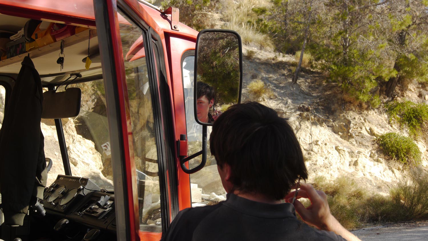 Die letzte Etappe vor unserem Ziel. Mit feinem Schleifpapier mache ich die Klötze noch glatter. Wir kommen an Granada vorbei, dann hoch nach Lanjarón. Ein Kurort, die Luft herzhaft, der Rasen saftig, Blumenrabatte. Es ist hier oben merklich kühler. Ich rufe Jasper an, verstehe ihn am Telefon schlecht, die erste Befangenheit, Peinlichkeit, ist mein Englisch so schlecht? Ob wir einen Schlitten mit hoch nehmen können, drei Meter lang? Ja klar, aber wozu braucht man in Südspanien einen Schlitten? Sierra Nevada hin oder her. Liegt bei Euch so viel Schnee? Der Schlitten ist eine Rutsche. Slight, slide. Äh, ach so. Wir treffen uns in eineinhalb Stunden an der Tankstelle am anderen Ende des Ortes, soviel ist klar.