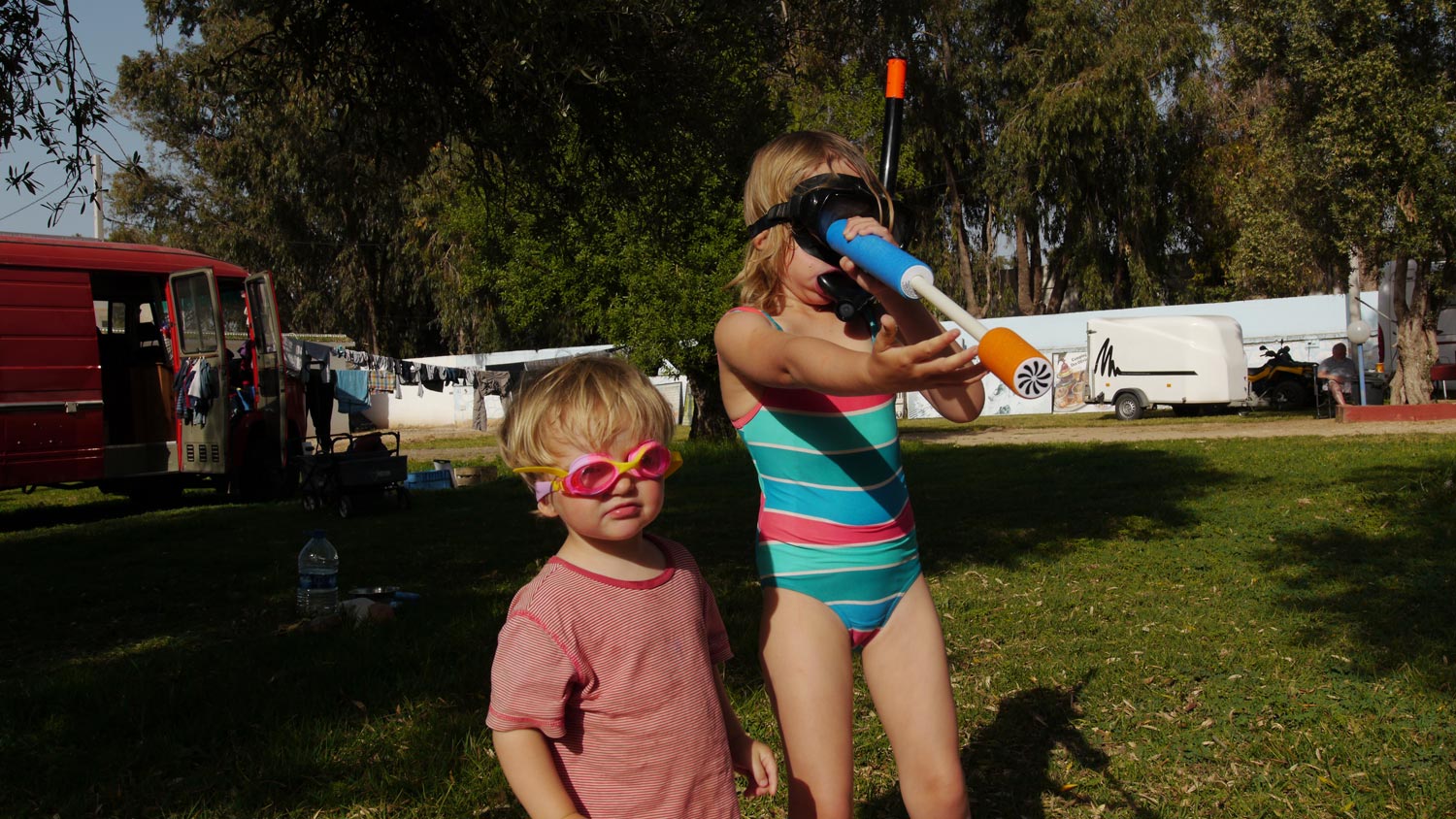 Der Mann mit den lila Beinen und seine Frau sind noch da. Sie parken um, wahrscheinlich, damit sie uns besser beobachten können.