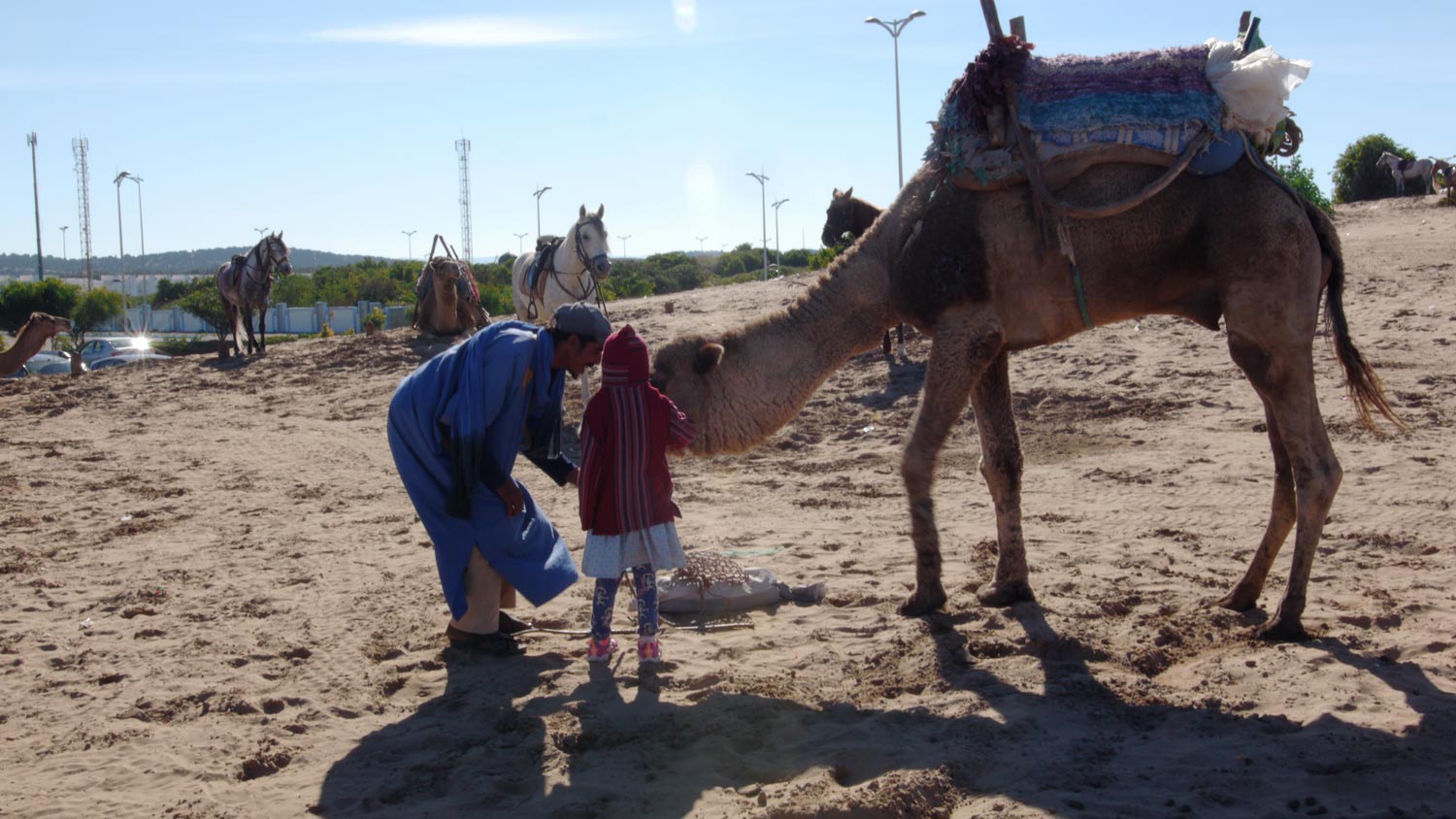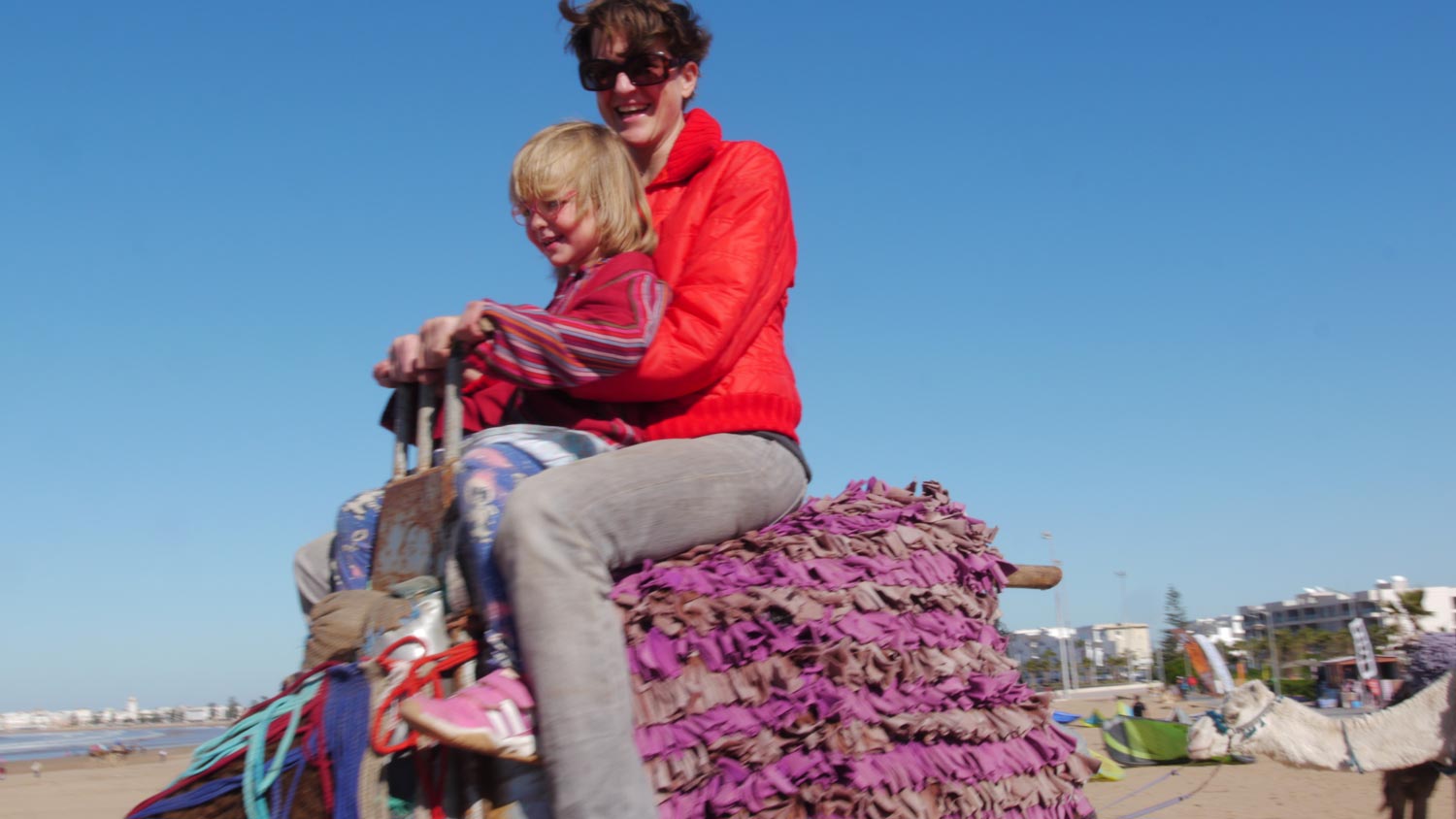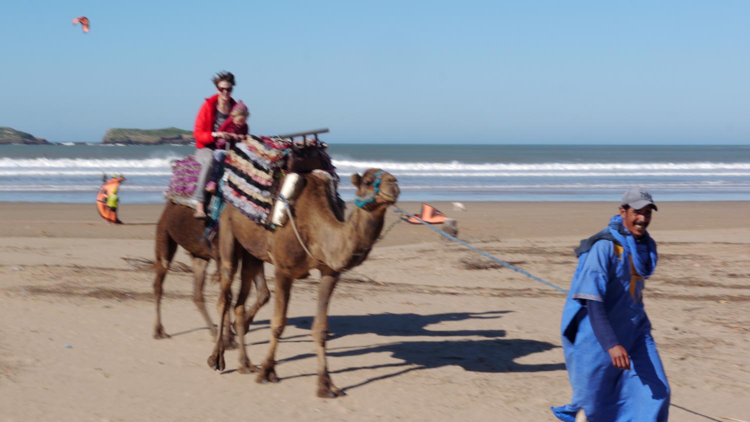 Das Aufrappeln des Dromedars ist gleichzeitig der Höhepunkt. Chocolat streckt zuerst seine Hinterbeine, dann die Vorderbeine. Wir purzeln fast vornüber. Ich bin froh, dass Toni nicht alleine auf dem Tier sitzt. Wie groß die Füße sind und wie wenig tief die Abdrücke im Sand. Menschenabdrücke sind tiefer. Abdul führt Chocolat am Saum des Wassers entlang, als eine Welle die Füße des Dromedars umspült, tänzelt es seitwärts Richtung Strand. Toni ist erregt. Volker und Peppi erwarten uns mit gezückter Kamera. Abdul will Peppi auch zu uns hoch heben, sie schreit und klammert sich an Volker fest. Peppi ist auf der Reise noch nicht zur Tierfreundin geworden.