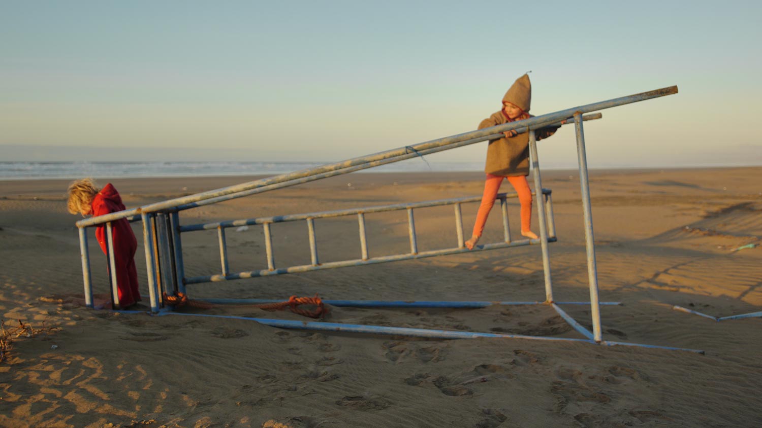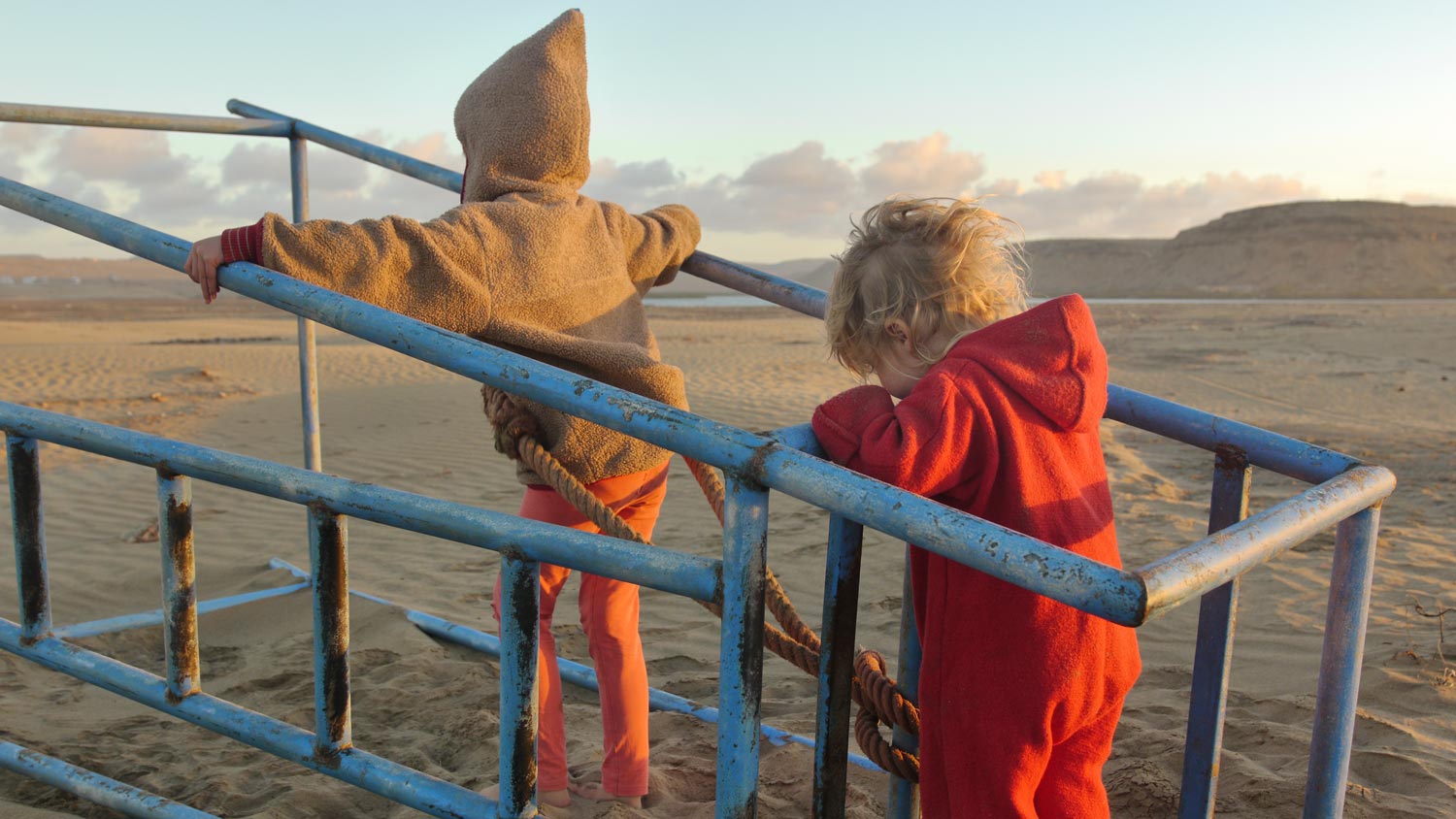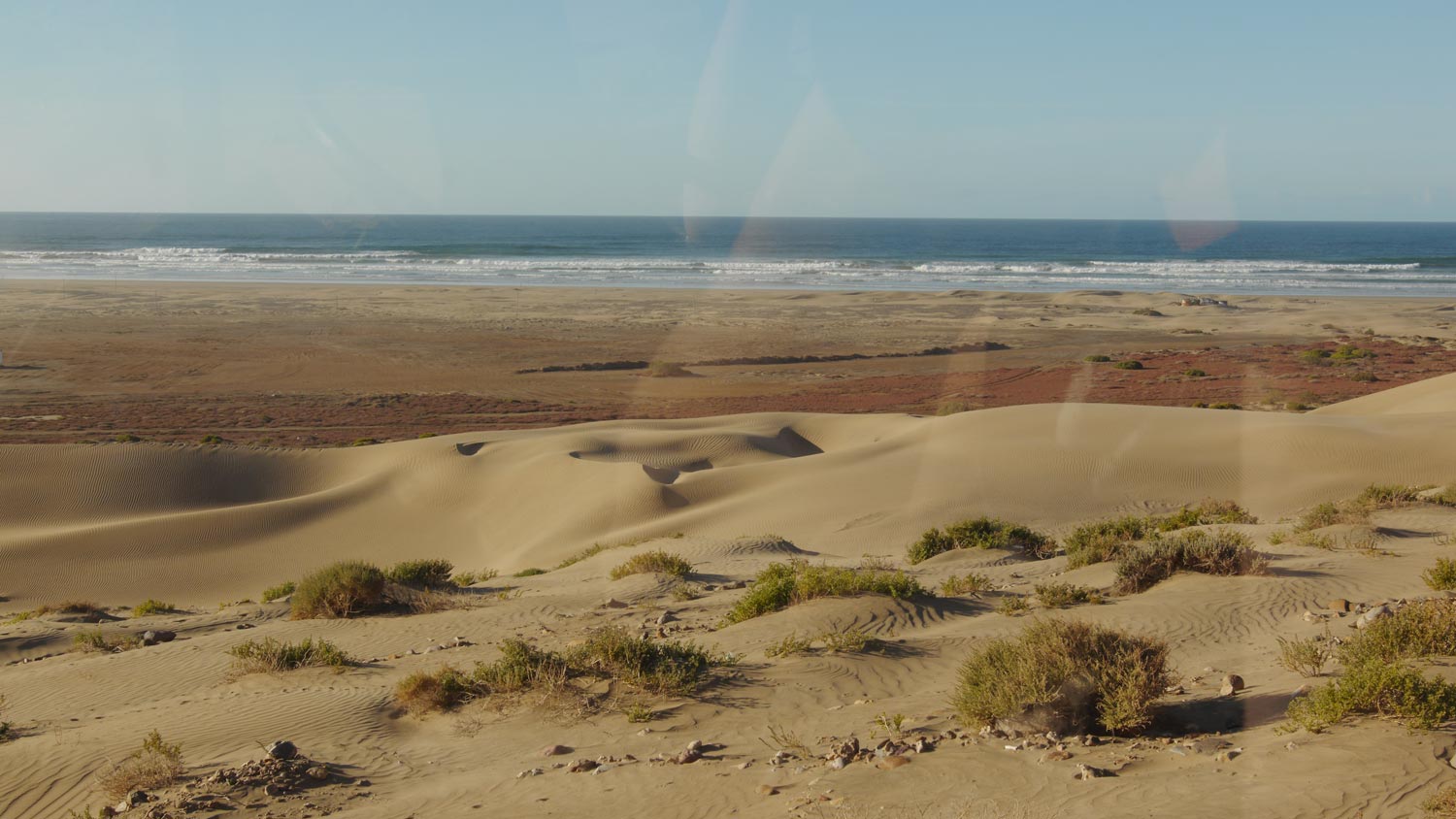 Wir fahren trotz der unkenden Rentner zur Plage Blanche. Auf den 60 Kilometern dahin kommt uns ein einziges Auto entgegen. Links und rechts Weite, hier wohnt kein Mensch, hier ist kein Mensch. Die Landschaft ist nochmal anders als die Wüste in der wir die letzten Tage waren, hügeliger, dunkler. Der Sandstrand am Ende dieser Straße ins Nirgendwo ist wirklich riesig, mehrere hundert Meter breit, und erstreckt sich links und rechts so weit das Auge reicht. Die Flussmündung versickert, bevor sie das Meer erreicht. Dahinter neigt sich die Sonne schon dem Horizont entgegen.