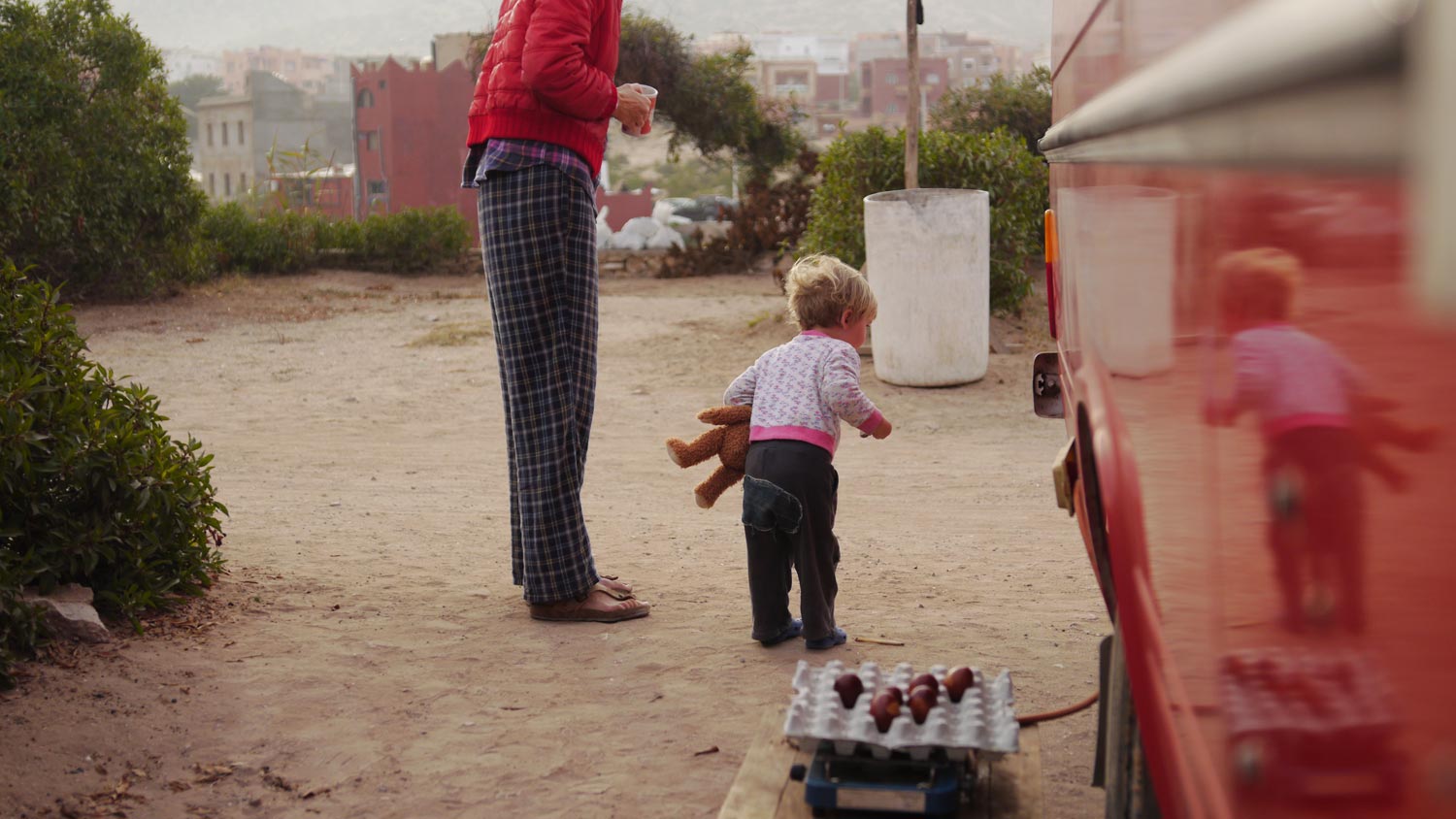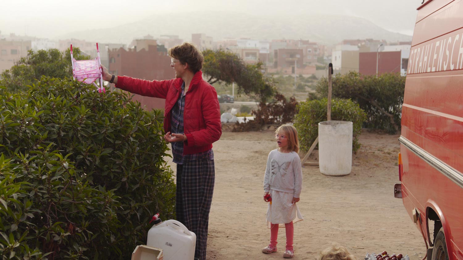 Wie Toni es vorhergesehen hat, findet uns der Osterhase, obwohl wir am Ende der Welt in Marokko sind. Er hat sogar zwei rosa Puppen-Buggies hergeschleppt, Toni hat sich so ein Plastikding schon ihr halbes Leben gewünscht.