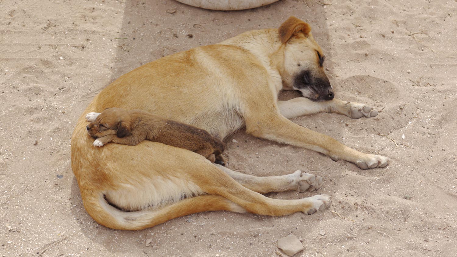 Dem kleinsten Hündchen, dem hellbraunen, geht es gar nicht gut. Es scheint geschrumpft zu sein, liegt mitten auf der Straße auf der Seite und atmet schwer. Es leckt nicht mal mehr die Butter, die ich ihm hinhalte. Ich trage es zu den anderen zurück in den Schatten.