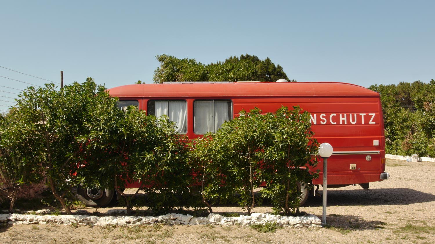 Es stürmt noch genauso wie am Tag zuvor. Volker arbeitet an klareren Indesign-Skizzen von allen Möbeln. Grundrisse und Frontalansichten. Ein brauner Düdo ist auch da, mit zwei riesigen Ausbuchtungen auf dem Dach, die eine besteht aus der oberen Hälfte eines Kleinwagens. Die Idee ist natürlich charmant, aber formschön ist das nicht, sieht aus wie eine riesige Eiterbeule. Volker hat dort gestern sogar Kinder gesichtet, aber der zum Düdo gehörige Mann ist so ein langhaariger, cooler Hippie, dass ich sofort erschrecke, und nur schnell bonjour murmele, statt das Gespräch zu suchen. Bei dem Wind sind sowieso alle drin.