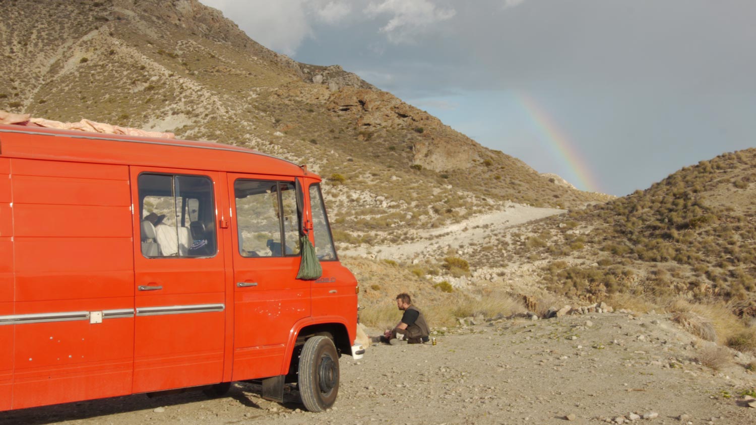 Der schöne Weg durch menschenleere Berge zu der gesuchten Bucht. Nur ein Fahrradfahrer kommt uns entgegen. Der Parkplatz von San Pedro. Die beiden roten Vans. Die jungen deutschen Punks neben uns, aus Berlin. Ich bin auf dem Dach und schließe die Kabel an und klebe den Kabelschlauch fest.