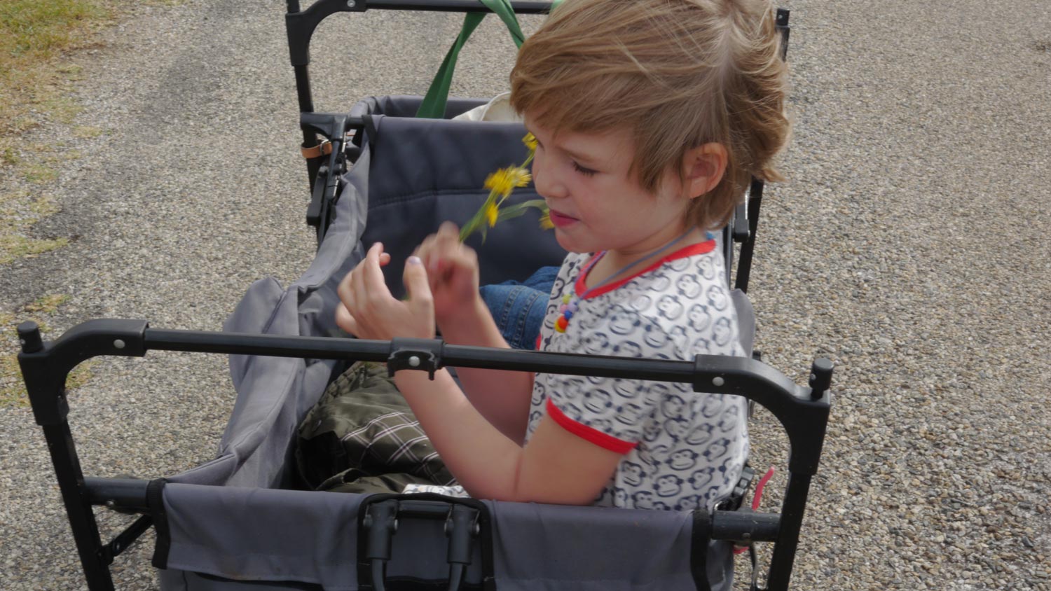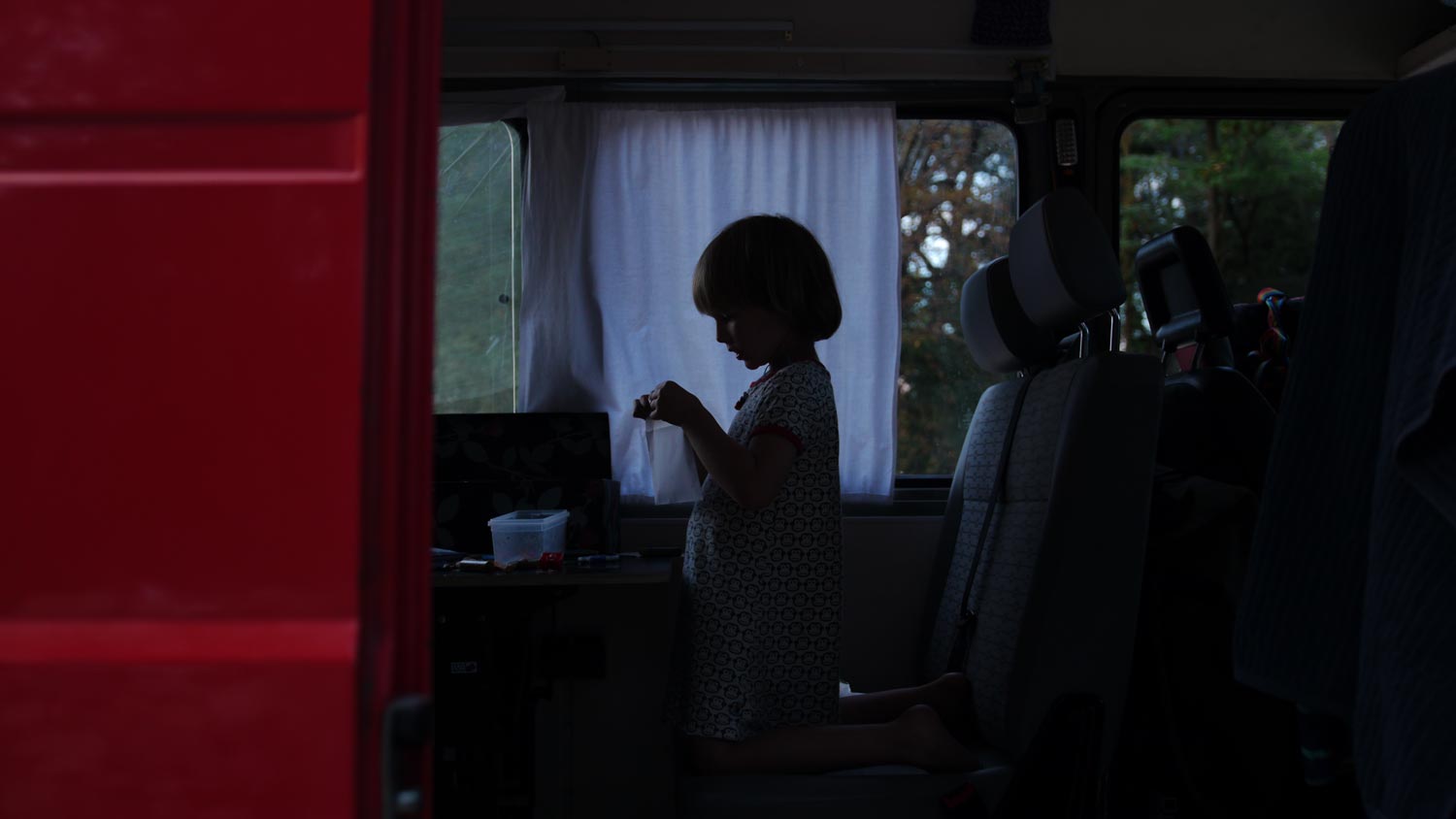Abends will ich mit Toni nochmal aufs Klo, aber sie sind besetzt von Erntehelfern. Die Fenster leuchten und man hört duschen. Im Licht von Scheinwerfern brausen Menschen irgendwelche Ernte-Utensilien ab. Wir sind mitten in den Vendanges. Toni und ich gehen unverrichteter Dinge zurück zum Düdo, ich trage sie, weil sie Angst vor der Dunkelheit hat.