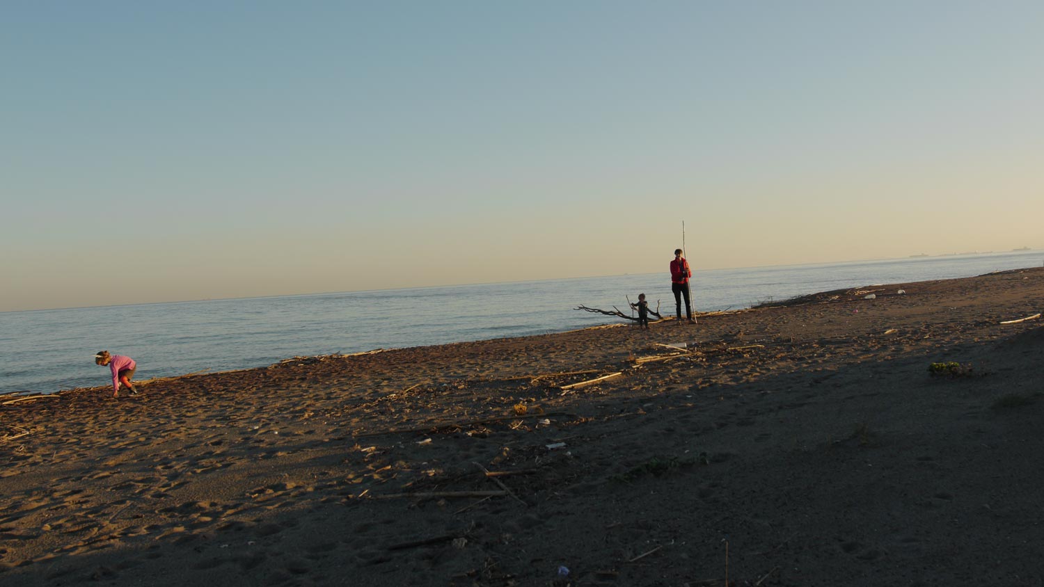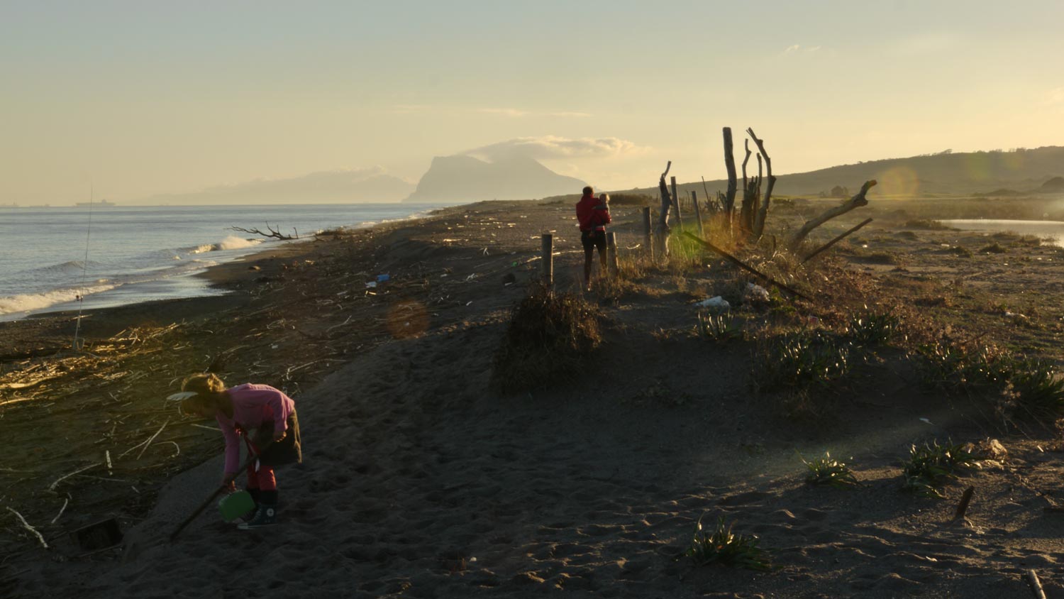 Im Westen leuchtet der Affenfelsen von Gibraltar lila im Sonnenuntergang. Da wollen wir morgen hin. Toni will ein Eis haben, wir haben ihr auch eines in Aussicht gestellt, in Unkenntnis der nicht vorhandenen Infrastruktur an diesem Strand. Sie weint. Eigentlich ist der Plan, heute doch noch weiter zu fahren, also wieder Nachtfahrt mit den schlafenden Kindern, um morgen früh gleich näher an Gibraltar zu sein, sind dann aber doch zu müde, also ich bin zu müde.