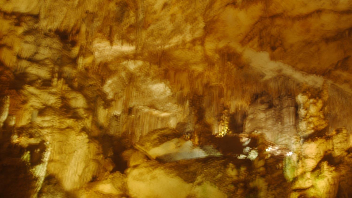 Wir nutzen ausgiebig das Höhlen-Klo, schließlich werden wir ja als zahlende Kunden reingehen, in die Höhle. Noch ist die Höhle aber zu, nur das Klo ist schon offen. Man zieht an einem Automaten die Tickets für einen bestimmten Zeitslot. Wir sind eine Viertelstunde vorher da und gehen vorsorglich nochmal pullern. Plötzlich sind wir Touristen inmitten anderer Touristen. Bevor es in die Höhle reingeht, wird auf einer Kinoleinwand eine Slide-Show zum Thema „Was alles in der Höhle verboten ist“ gezeigt. Man soll vorher nochmal pullern gehen, weil es in der Höhle selbst kein Klo gibt. Haben wir ja gemacht. Man soll nicht laut sprechen. Und so weiter. Los geht’s. Es gibt eine Führerin, aber sie sagt kein Wort, denn es gibt ja die Audioguides. Sie bleibt nur an den jeweiligen Stellen stehen, dann lauschen alle in ihre Kopfhörer. Ich flüstere Toni zu, was der Audioguide sagt, denn sie hat leider keinen bekommen, weil Kind. Sie will ihn selbst haben, ich gebe ihn ihr, und bin nun meinerseits abgeschnitten von den Informationen, was es mit der Höhle nun auf sich hat. Ziemlich bald flüstert Toni mir zu, dass sie pullern muss. Ich sage, dass wir dann raus müssen aus der Höhle und nicht wieder rein dürfen, der Fall wurde in der Slide-Show ja erörtert. Das will sie auf keinen Fall. Also weiter. Toni macht sich Sorgen, dass die Stalagtiten auf uns runterfallen könnten. Sie will jetzt doch raus. Aber wir sind mitten drin. Und Teil des Pulkes. Ich mutmaße, dass zurück weiter ist als voran. Ich mache noch ein Foto von Toni in der Höhle, es ist wahnsinnig unscharf weil erstens megalange Belichtungszeit weil dunkel und zweitens weil sie auf und ab hopst wegen dringend müssen.