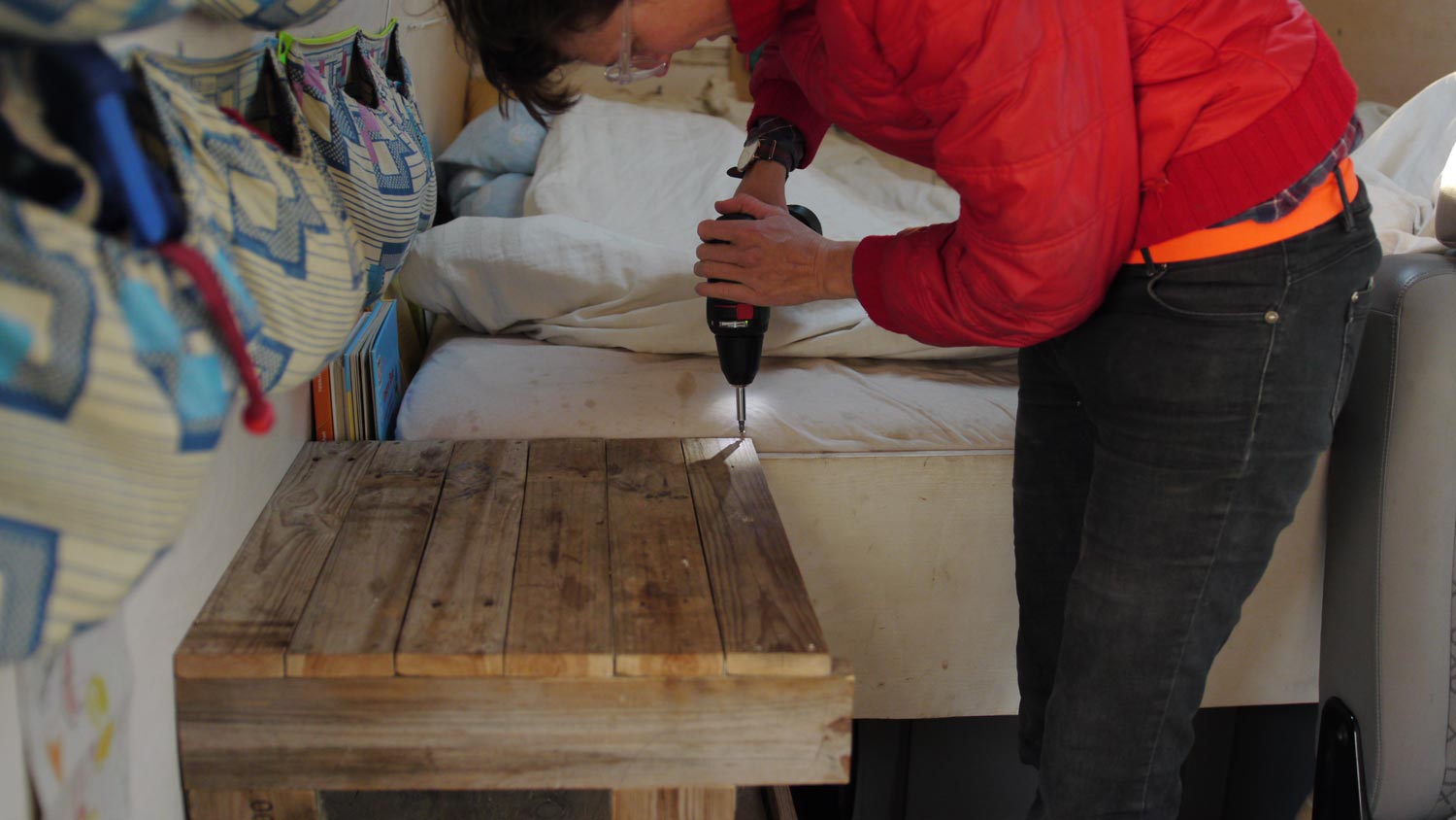 Ich bin weniger Alis Watchdog als seine Assistentin, das ist natürlich gut. Er redet mit mir wie der Arzt mit der Arzthelferin am Operationstisch: Hammer. Bohrer. Akkuschrauber. Sein Kollege scherzt: „Tu apprends le métier!“ Vor allem lerne ich lauter französische Werkzeug-Vokabeln. Und bin natürlich trotzdem der Watchdog mit dem Zollstock. Ali mag ein Meister seines Faches sein, Abmessen ist nicht sein Ding. Ich sehe mit bloßem Auge, dass seine Winkel nicht rechtwinklig sind und seine Regalbretter nicht horizontal. Warum sieht er es nicht? Trotzdem: Wenn wir alles selber pingelig abmessen würden, würden wir nicht zwei Wochen sondern zwei Monate brauchen. Der Kompromiss aus Alis Schnelligkeit im Einbau und meinem Zollstock ist nötig. Ich bin froh, dass er mir meine Nachmesserei nicht übelnimmt. Die Stimmung bleibt bis zum Ende gut. Wir lernen uns richtig ein bisschen kennen.