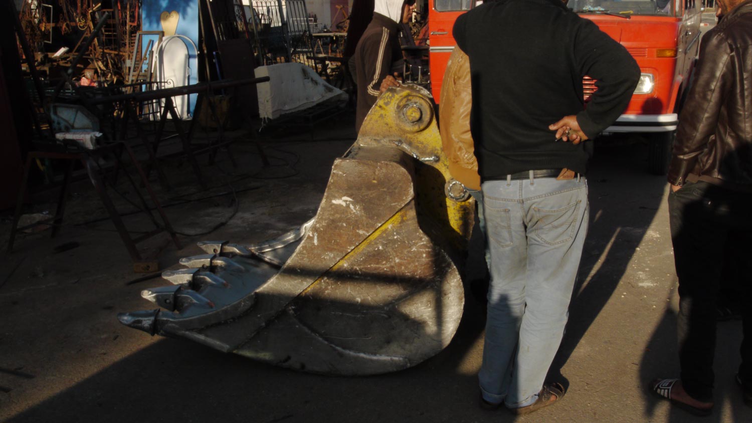 Wir stehen noch da und lachen schicksalsergeben, als wir sehen, wie nah der Bagger an der Düdoschnauze vorbeirangiert. Der Schmied, der uns den Stahlträger abflext, auf dem bisher das Fußende unseres Bettes ruhte, hat gerade eine riesige Baggerschaufel fertig geschweißt. Jetzt probiert der Baggerfahrer, das Ding mit dem Baggerarm in die richtige Position zu schubsen, um es aufzunehmen. Alles keinen Meter vom Düdo entfernt. Wir sehen die Gefahr. Aber wir schreiten nicht ein, weil wir wissen, dass außer uns keiner ein Problem sieht, und dass es daher mit allergrößtem Aufwand verbunden wäre, den Düdo einen Meter zurückzusetzen.