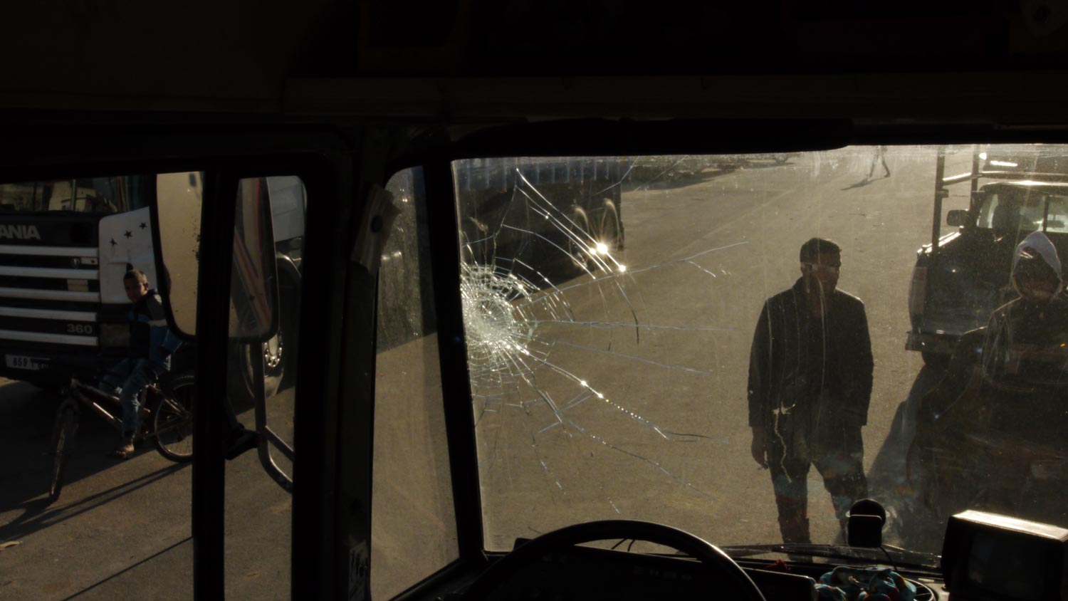 Es ist kein Steinschlag, eher ein Felsschlag. Ein Hieb mit dem Baggerarm. Wir könnten so nicht fahren. Im ersten Moment finde ich es lustig, nicht schlimm. Es ist so filmhaft kurios.