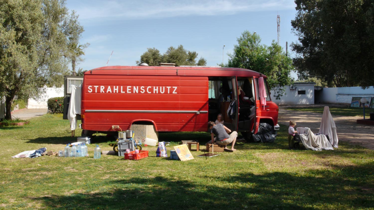 Der Verkäufer nimmt den Gaskocher anstandslos zurück, fragt mich, was ich dafür gezahlt habe, und gibt mir das Geld wieder. Das Problem leuchtet ihm ein: Der benötigte Gasdruck stimmt nicht mit dem unserer Gasanlage überein. Ich bin so freudig überrascht, wie unkompliziert und unbürokratisch das geklappt hat, dass ich das Geld sofort im Haushaltswarenladen nebenan ausgebe. Ein Kühlfässchen, das uns provisorisch mit Wasser versorgen wird. Blechteller und -schüsseln. Und eine große Plastiktonne mit roten Henkeln, die wir während der Fahrt an der Rückleiter befestigen werden, gefüllt mit Wasser und dreckiger Wäsche, als Reisewaschmaschine.