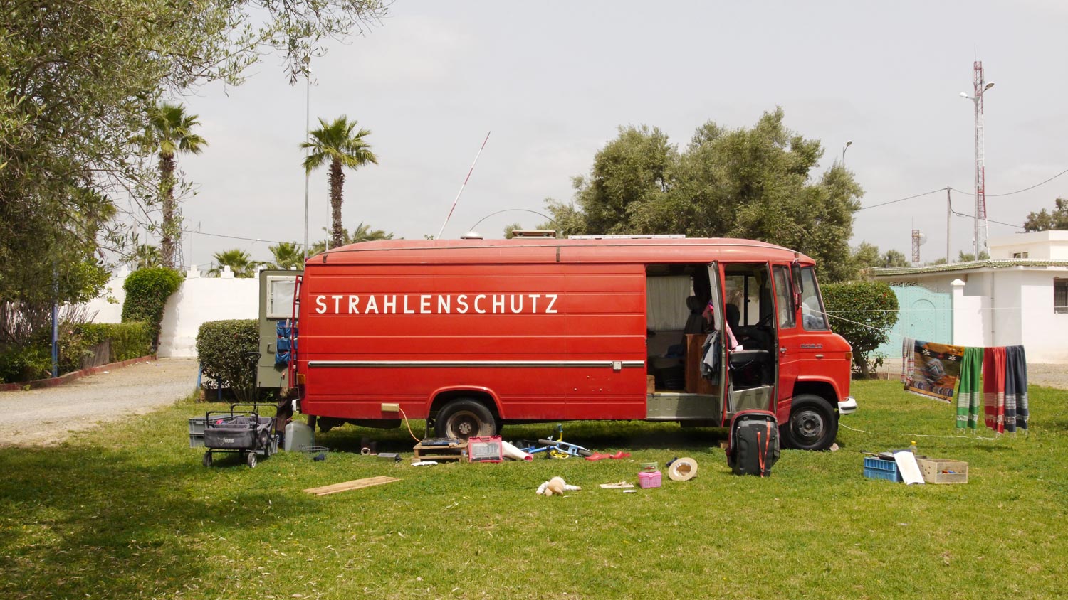 Beim zweiten Anlauf finden wir zum Schneider. Wir haben nicht den bekannten Weg über die Strandpromenade und dann rechts bis zur Moschee genommen – ein Umweg, unserem Orientierungsgefühl nach – sondern haben uns schon früher rechts auf den großen Boulevard geschlagen, dann aber die Abzweigung nach links verpasst. Wir müssen mal wieder ausgerechnet in die Straße, die gerade mit Schülern in ihren weißen Kitteln geflutet wird. Irgendwie ist immer Schulschluss, wenn wir mit dem Düdo in Essaouira unterwegs sind.