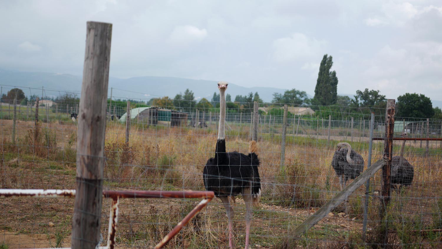 Nächstes Ziel Straußenfarm. Wieder der Fehler erst dran vorbeigefahren weil im Führer der Weg von der anderen Richtung aus beschrieben wird und ich es erst in Livron merke. Zum ersten Mal ein skeptischer Empfang von einem braungebrannten Outdoor-Alphatier. „Nous pouvons nous poser?“ „Ça depend.“ Ob wir einen Abwassertank haben. Nein. Dann geht es nicht. Dann geht es doch. Eine riesige Wiese neben der Kiwi-Plantage, der Stellplatz ist einer der schönsten. Im Hintergrund die Berge. Drôme. Das Wetter ist diesig, seit wir im Süden sind, ist der Sommer vorbei. Wir kaufen Steaks und Salami. Die Strauße haben riesige Füße.