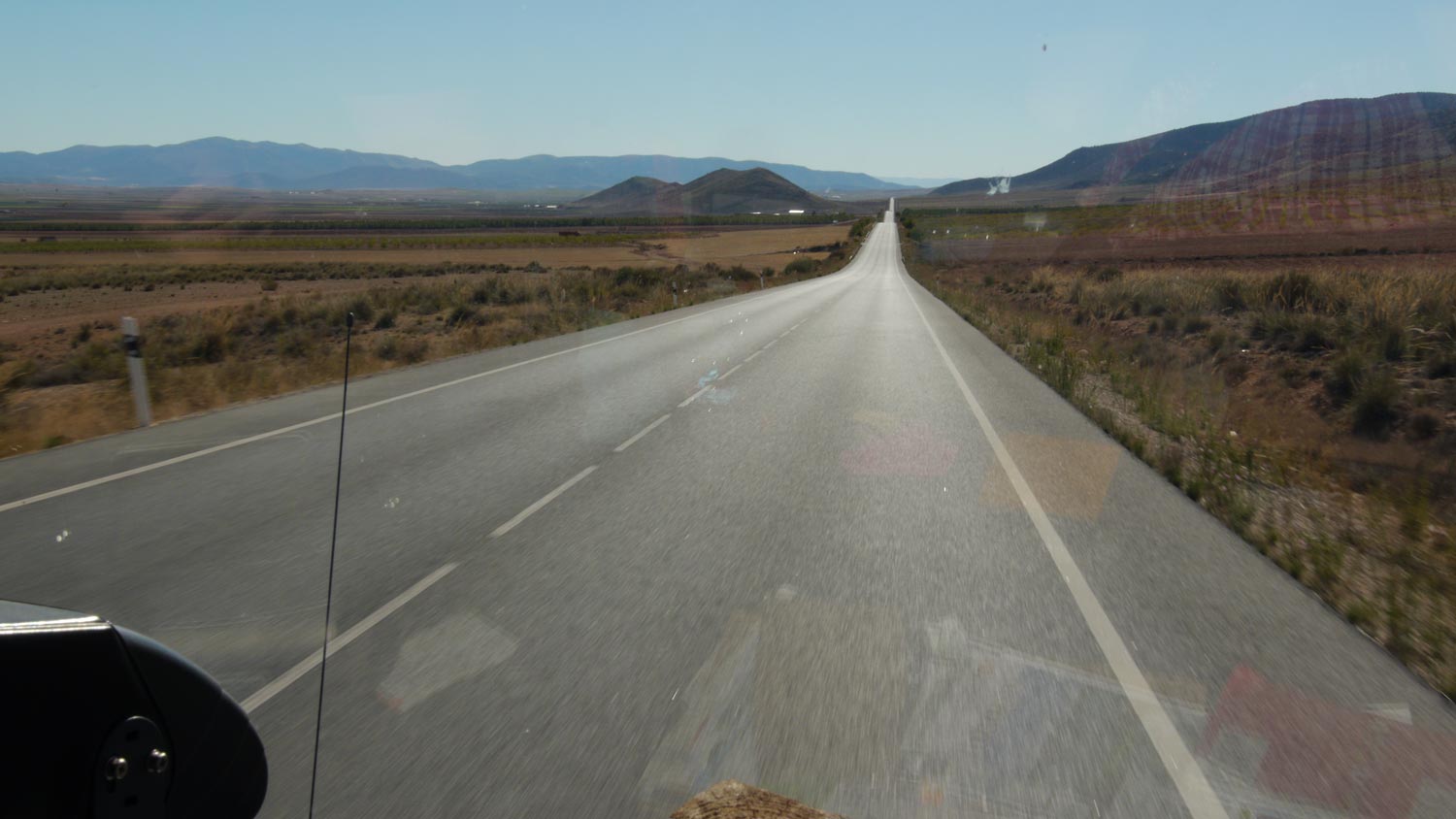Wir brettern weiter durch den wilden Westen. Ich schreibe Jasper und Steph eine Mail, dass wir sehr wahrscheinlich übermorgen da sein werden: „We advance much faster than in France“. Wir steuern wieder einen Embalse an. Bei Purullena fährt Volker am Kreisverkehr in die falsche Richtung, wir halten im nächsten Ort, pullern und wenden. Die richtige Straße führt uns erst an ein Plateau hoch über dem Embalse. Der Blick ist schön, der Platz unglaublich vermüllt. Wir wollen runter ans Wasser. Die Straße ist eng und kurvig, teilweise von rechts halb verschüttet von Steinlawinen, nach links bricht der Asphalt stellenweise weg. Aber wir müssen weiter, wenn wir nicht im Rückwärtsgang wieder hoch wollen. An der ersten Parkbucht wendet Volker, weil er lieber gleich in Fluchtrichtung stehen will. Eine junge Frau, die offenbar ihren Hund hier spazieren führt, will in der selben Parkbucht wie wir parken, wir sollen etwas vorfahren. Wie fast alle Spanier die wir treffen, spricht sie kaum ein Wort englisch, ich radebreche meine Spanischbrocken.