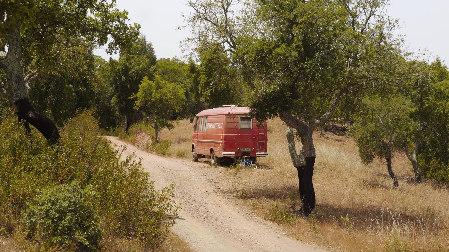 Volker kriegt den Vormittag, immer noch der Auftrag. Ich bastele mit den Kindern Strandgut-Mobiles im Schatten einer Korkeiche. Man hat den Bäumen die Rinde abgezogen, die Stämme stehen gelb und nackt in der Landschaft. Ein paar Kilometer im Landesinneren ist gleich ein ganz anderes Klima, es ist schon früh am Morgen so warm, dass man sich intuitiv ganz langsam bewegt. Hochsommergeräusche, Grillen, der heiße Wind raschelt in trockenen Gräsern.