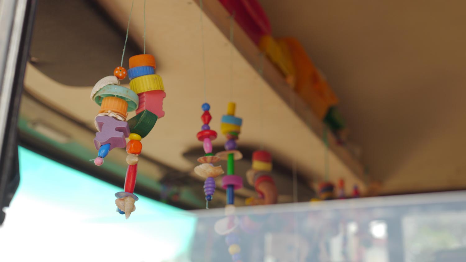 Diesmal hole ich den Akkuschrauber, hatte nach dem letzten Mal, als wir am Strand von Murração Plastikdeckel-Mobiles mit allen Kindern gebastelt haben, fast eine Sehnenscheidenentzündung vom Drehen mit dem Handbohrer. Aber für Löchlein in den Muscheln ist der Handbohrer perfekt. Sogar Peppi fädelt ruhig und geduldig Kette nach Kette. Peppi kann ich in Ruhe machen lassen. Aber leider kann ich es nicht lassen, Toni in ihre Kreationen rein zu quatschen. Gebe lauter ungebetene Tipps: Dass sie nach einer kleinen Muschel keinen Deckel aufziehen soll, weil der Deckel sonst die Muschel verdeckt. Dass sie nicht zwei Muscheln hintereinander aufziehen soll, sondern dass es hübscher sei, wenn eine Perle dazwischen komme. Dass sie keine Riesenmuschel in eine Kette fädeln solle, in der sonst nur kleine Schneckenhäuser seien. Ich finde mich selber schlimm, kann aber nicht damit aufhören. Finde unser Material – Muscheln und buntes Plastiktreibgut – so toll, dass ich will, dass ästhetisch anspruchsvolle Sachen daraus entstehen. Könnte man diese Dinger nicht sogar für viel Geld in Berlin verkaufen?