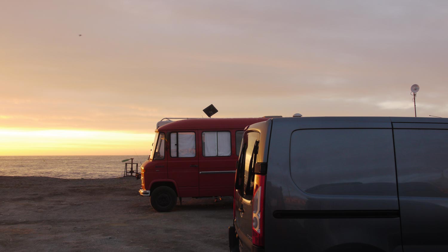 Jetzt müssten wir sofort los, um den Mittagsschlaf als Fahrtzeit zu nutzen. Aber es dauert, bis der Düdo abfahrbereit ist, wir überlegen es uns anders und wecken Peppi nach einer Dreiviertelstunde auf. Ich klettere auf Werners Dach, um mir anzusehen, wie sie ihr Solarpanel angebracht haben. Mit Winkelprofilen, mit Schrauben, sieht sehr machbar aus. Werner sucht eine Schraube mit passender Mutter, und bringt unsere Kupplungspedal-Feder wieder an. Sie laden uns ein, mit ihnen zu essen, am gedeckten Camping-Tisch am Strand, es gibt angebratenen Reis mit Speck und Gemüse, die Kinder fallen gierig darüber her. Margot freut sich, ich mich auch. Wir steuern wenigstens den Nachtisch bei, Paco-Käse mit Honig. Werner bietet an, mit uns die Solarplatte zu montieren. Wir wollen morgen in Málaga alles kaufen und dann wiederkommen. Wir Naivlinge.