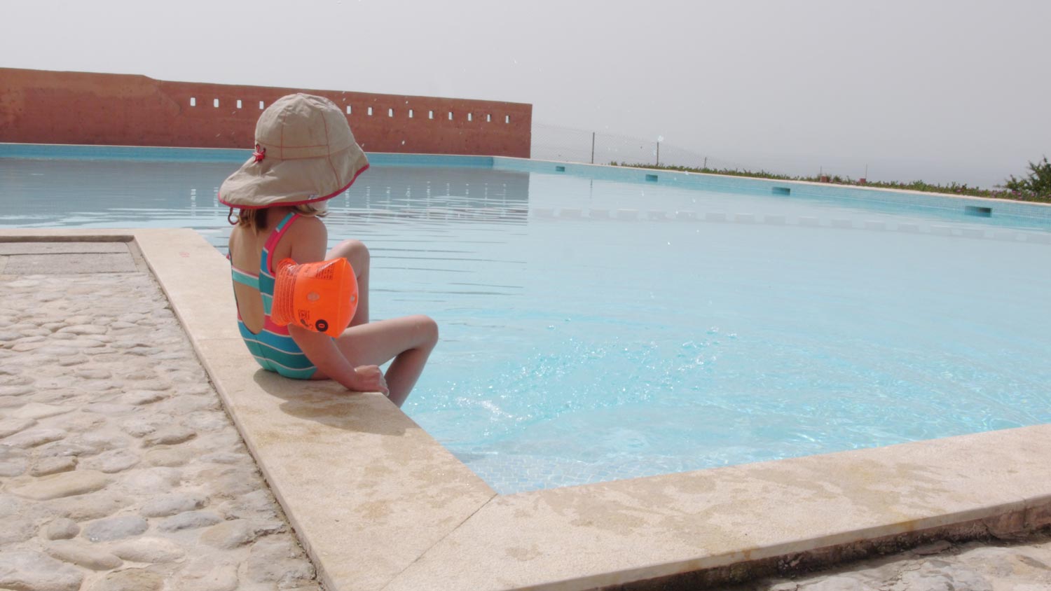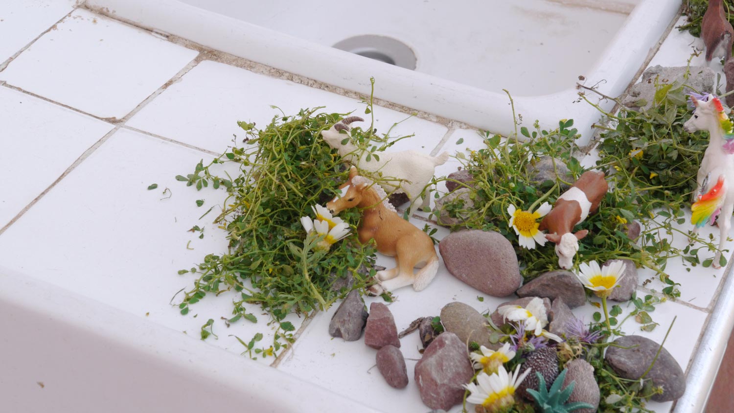 Großwaschtag. Wir haben fast nichts mehr. Ich wasche alles von Hand, weil mir 50 Dirham für eine 6-Kilo-Waschmaschine mit 40 Grad, die ich nicht mal selbst bedienen darf, zu viel sind. Wir machen Blütenbilder mit den Klebekarten von Kathi. Toni macht an den Waschbecken eine tolle Installation mit Gras, Blumen und den Schleichtieren. Mehr aus Zufall kaufe ich drei Seeteufel bei dem Fischer, der morgens vorbeikommt. Eigentlich wollte ich Krabben, aber Seeteufel war billiger und schon küchenfertig die Haut und alles abgezogen. Was für ein vorzüglicher Fisch, und wirklich fast keine Gräten! Die Kinder verschlingen jedes ein komplettes Tier.