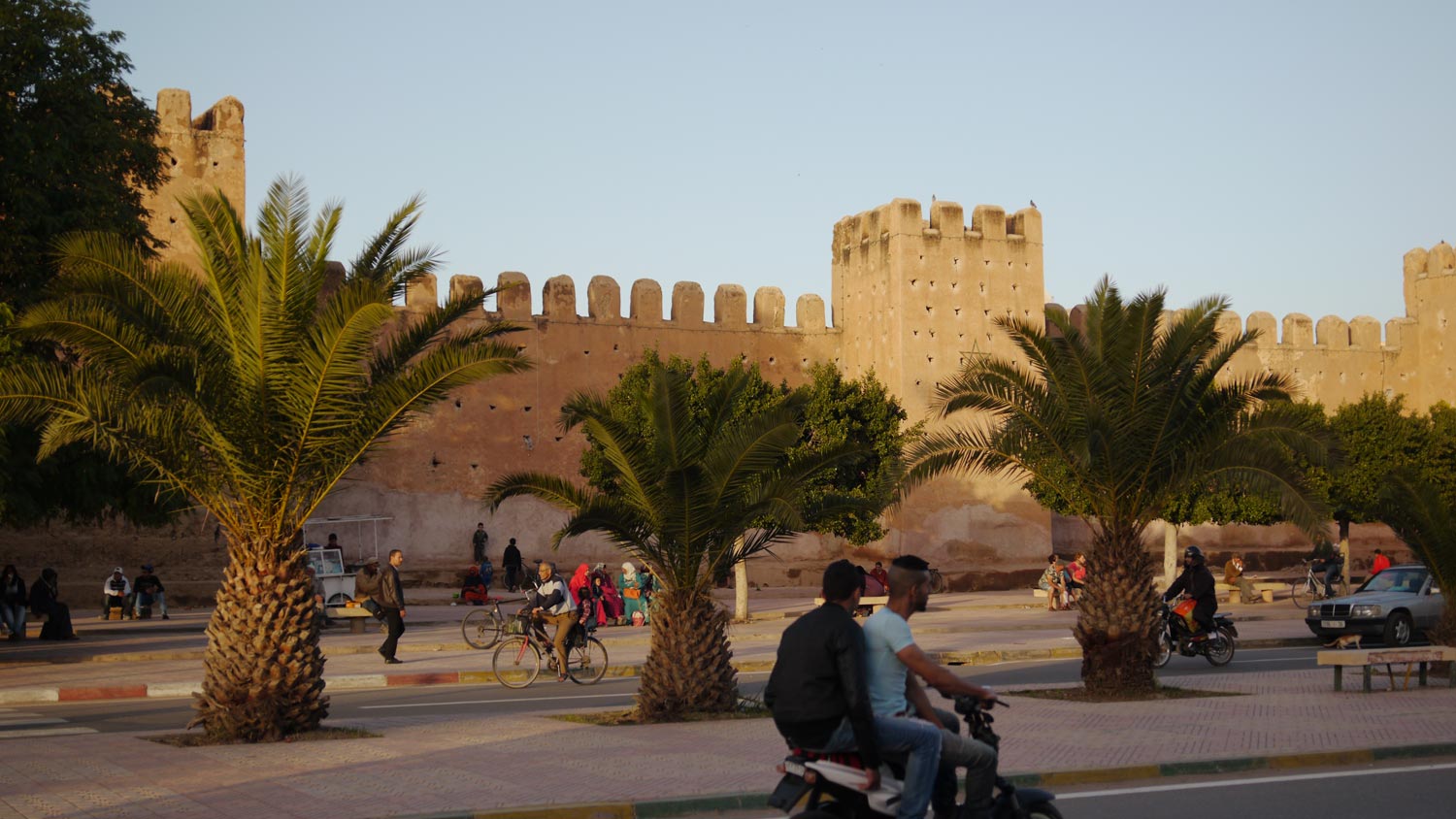 In Taroudannt ist es nochmal wärmer als überall wo wir bisher waren. Also in Zagora war es auch heiß, aber nur in der Sonne, die Luft selbst war frisch, was man daran merkte, dass man im Schatten sofort fröstelte. Hier plötzlich richtiger Sommer, warme Luft zum Reinkuscheln, die Nähe des Meeres. Auf dem Weg in die Stadt machen wir Halt an einem Spielplatz, wir scherzen: Der größte von ganz Nordafrika. Als wir draufstehen, merken wir: Es gibt zwar jede Menge Spielgeräte, aber es sind immer die selben: Mini-Rutschen, Schaukeln, und Wipp-Tiere. Gut für uns, Toni und Peppi sind, trotz wochenlanger Spielplatz-Abstinenz, bald mit allem fertig und wir können weiter. Alle sind hungrig.