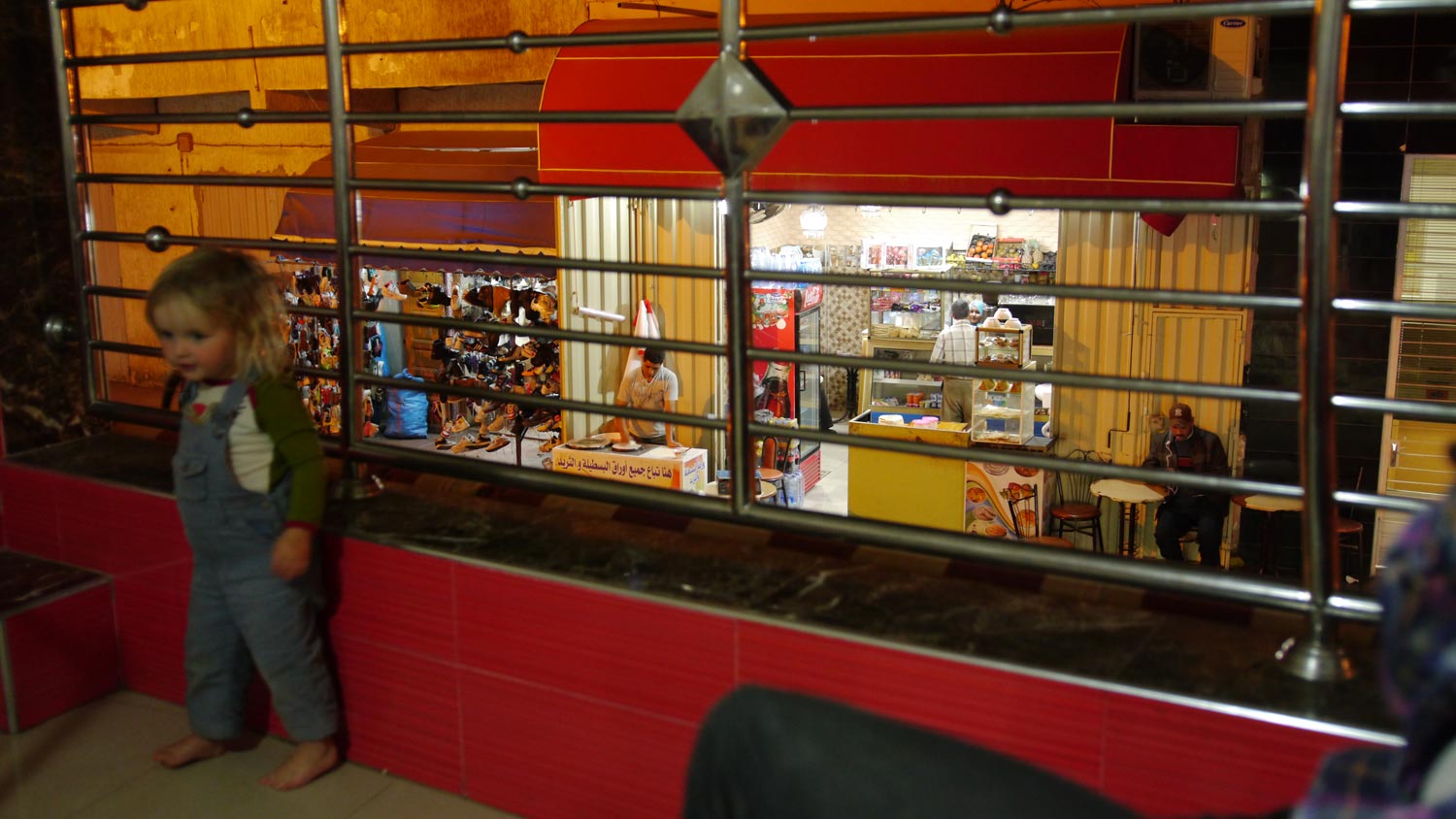 Ich ziehe mit Peppi die Straße entlang, auf kleine Holzverschläge zu, aus denen Rauch aufsteigt. Schmalzkringel, hatten wir gehofft, es sind aber Hühnchenspieße. Ich bestelle vier Spießchen à 1,5 Dirham, es dauert bis sie durch sind, ich versuche mit Peppi auf dem Arm dem dichtesten Qualm auszuweichen. Der Verkäufer streift die Spießchen in eine Brothälfte, gibt Tomatensoße dazu, bitte kein Chili, die Kinder, und wir wandern zurück zum Bollerwagen. Ich stopfe den Kindern abwechselnd Hühnchenstücke in den Mund, während wir versuchen, aus dieser recht finsteren Gasse wieder in belebtere Gegenden zu finden. Es gelingt schneller als befürchtet, unversehens stehen wir auf einem großen Platz, und Toni muss pullern.