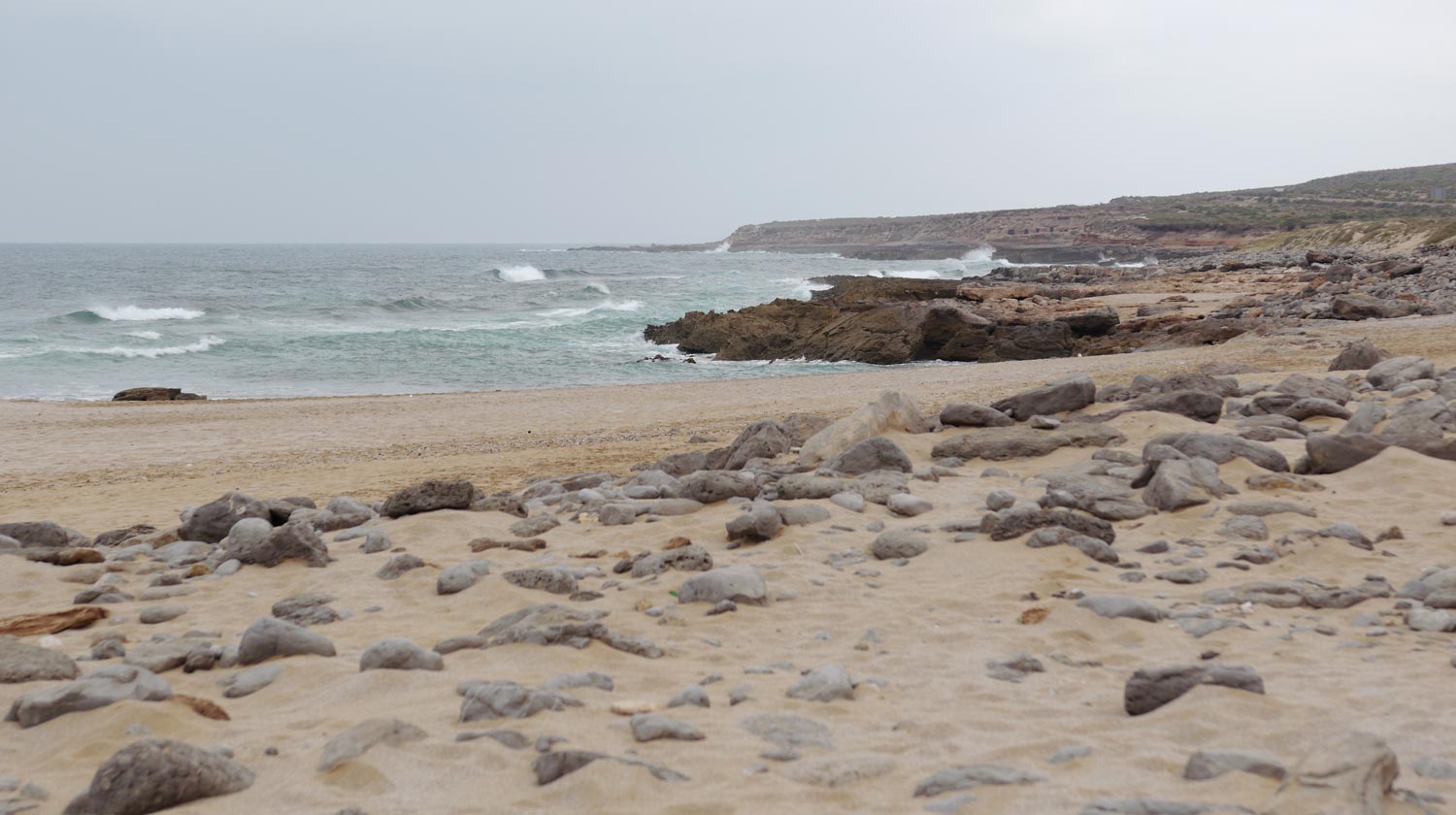 Am Morgen merken wir, dass die Bauruine, hinter der wir parken, eine quietschfidele Baustelle ist. Ein weißer, gesichtsloser Riegel mitten in der menschenleeren Heidelandschaft zwischen Straße und Küste – hier werden offenbar Ferienappartements hingekleckert. Uns fehlten die Schlüsselreize, um den Rohbau als Baustelle zu identifizieren, nämlich Maschinen. Aber es gibt Bauarbeiter, die Latten hin- und hertragen. Sie nehmen von uns keine große Notiz. Wir bleiben.