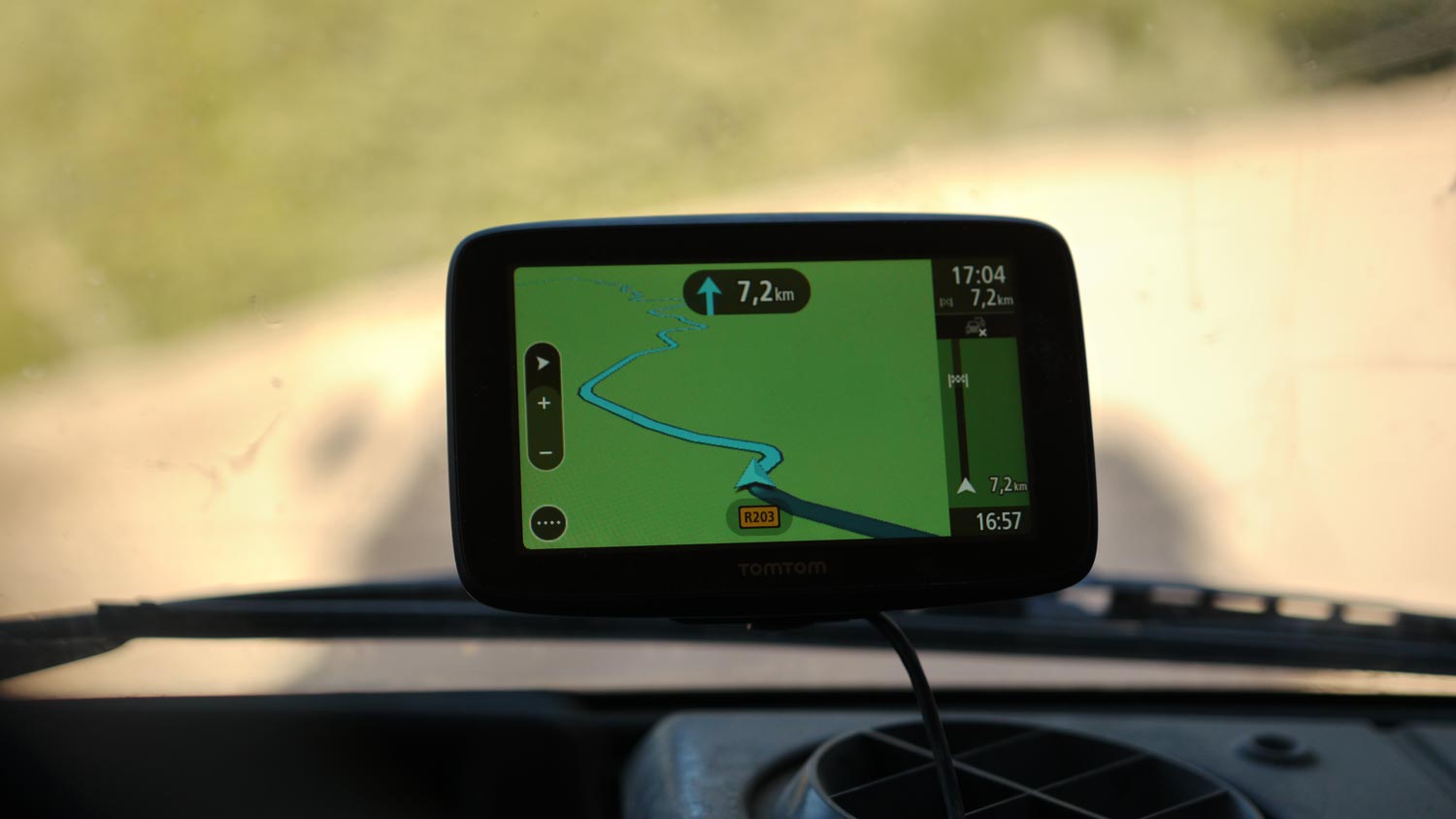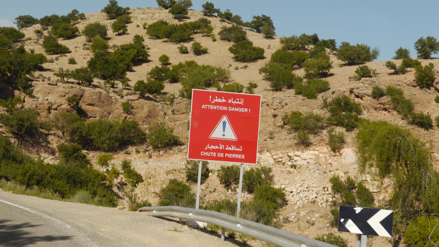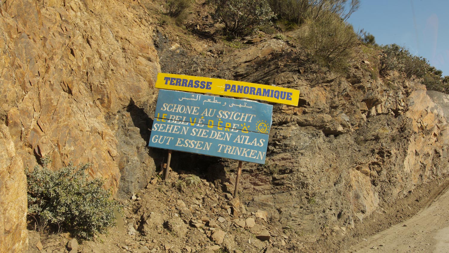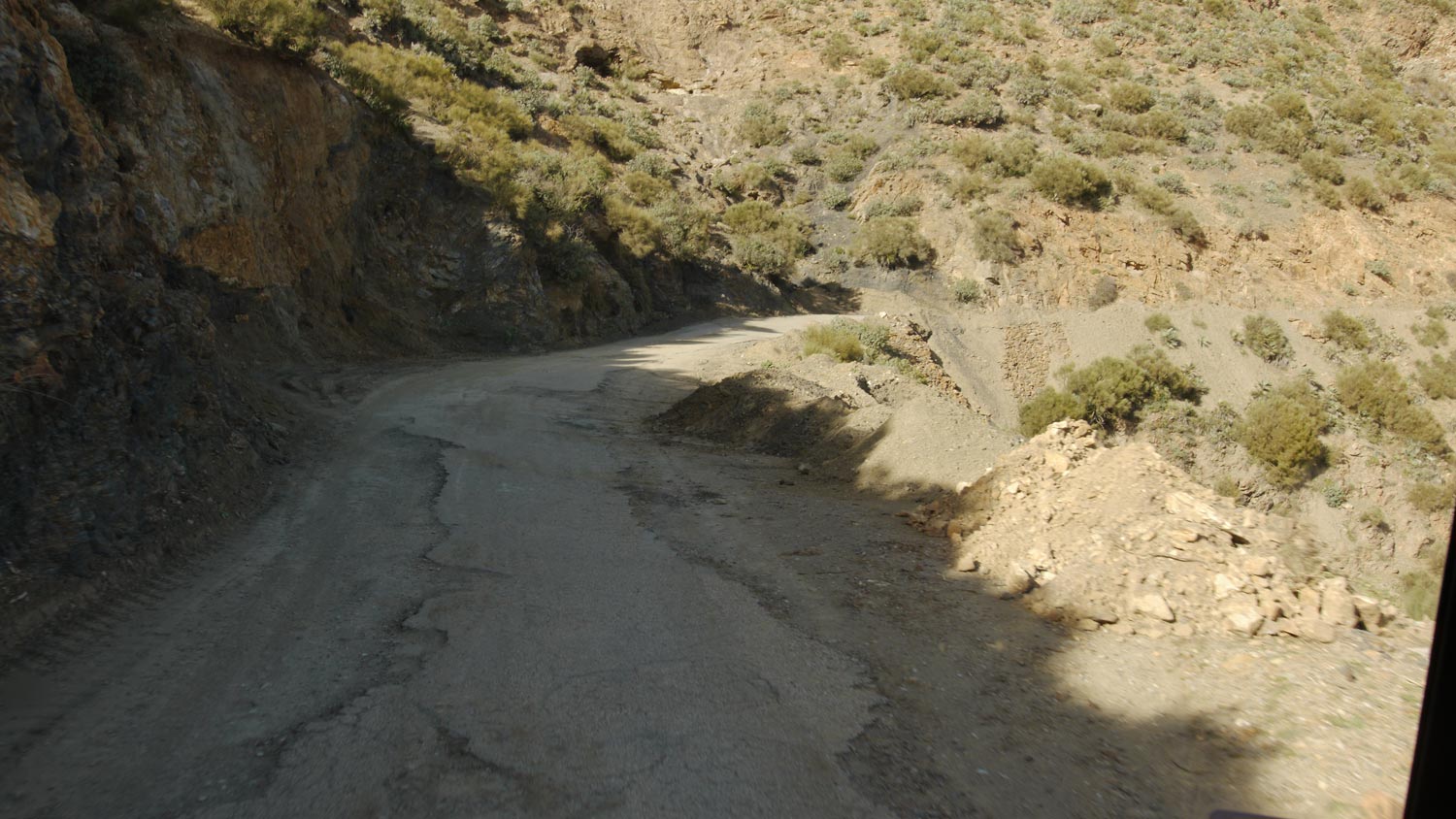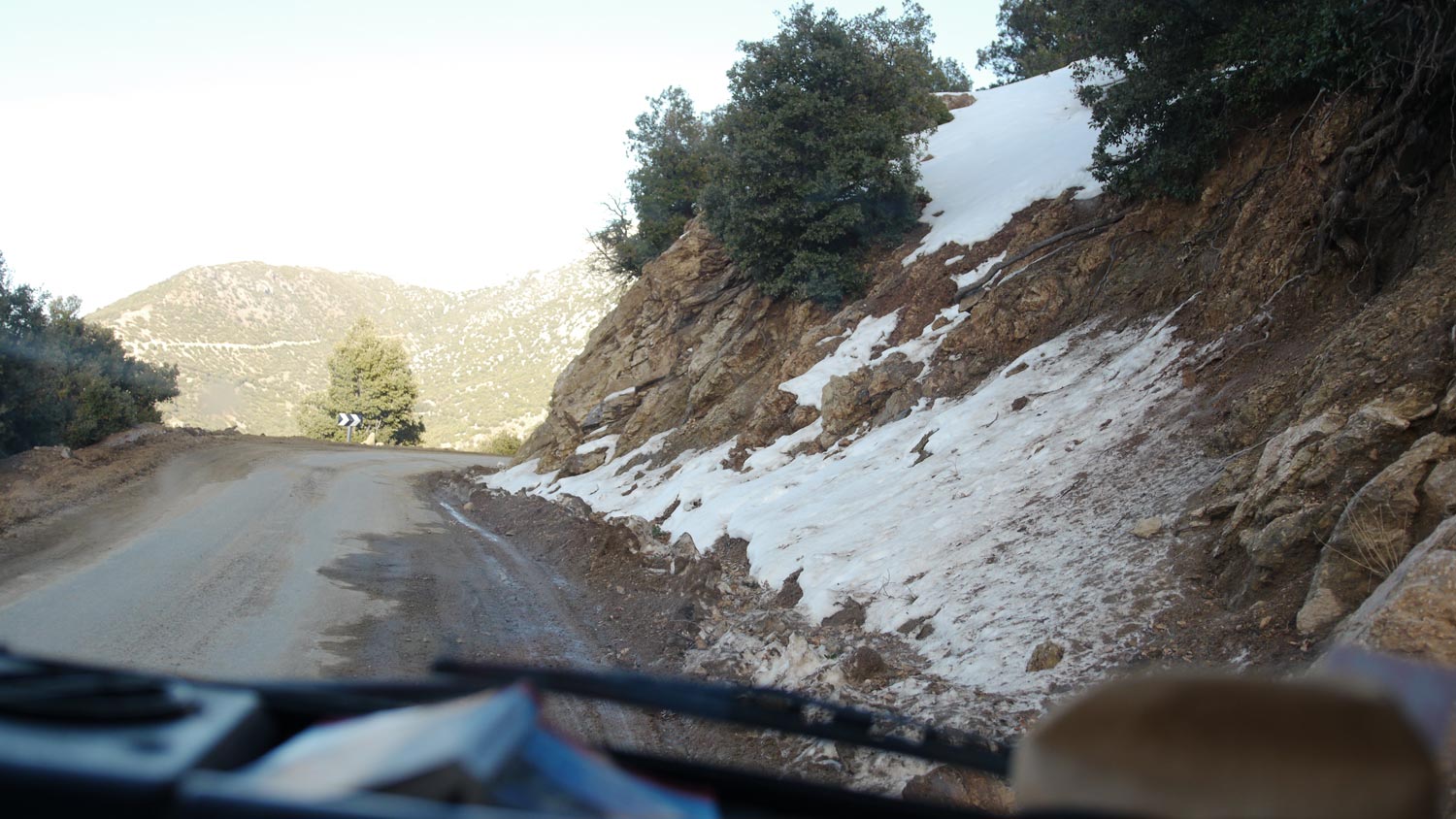 Der Pass ist weniger steil als befürchtet. Die versprochenen spektakulären Ausblicke ins Sous-Tal allerdings auch weniger toll als erhofft, es ist diesig und man sieht nicht weit. Die Fahrt selbst ist trotzdem grandios, die Straße kurvt in verrückten Serpentinen durch den schroffen Fels. An manchen Stellen fließen Bächlein über die Straße, bei Regen oder Tauwetter möchte man hier nicht lang. Um uns herum die schneebedeckten Viertausender. Aber Pass heißt ja, dass es, soweit möglich, durch Täler geht, Schnee liegt wirklich nur ganz oben. Wir halten an der höchsten Stelle kurz an, Volker bringt eine Schneekugel, es ist eigentlich eher bröseliges Eis, wie Slush Puppie.