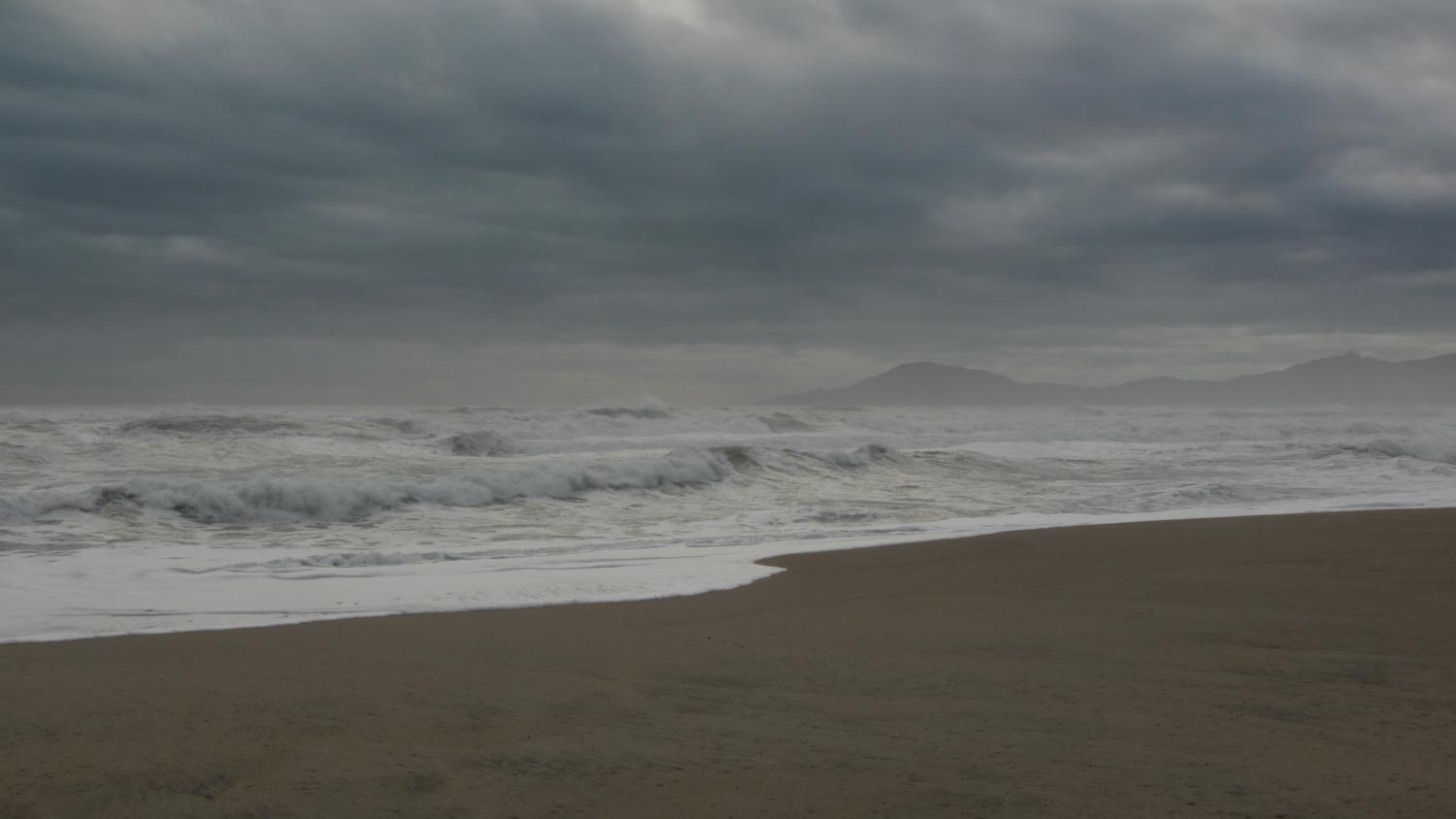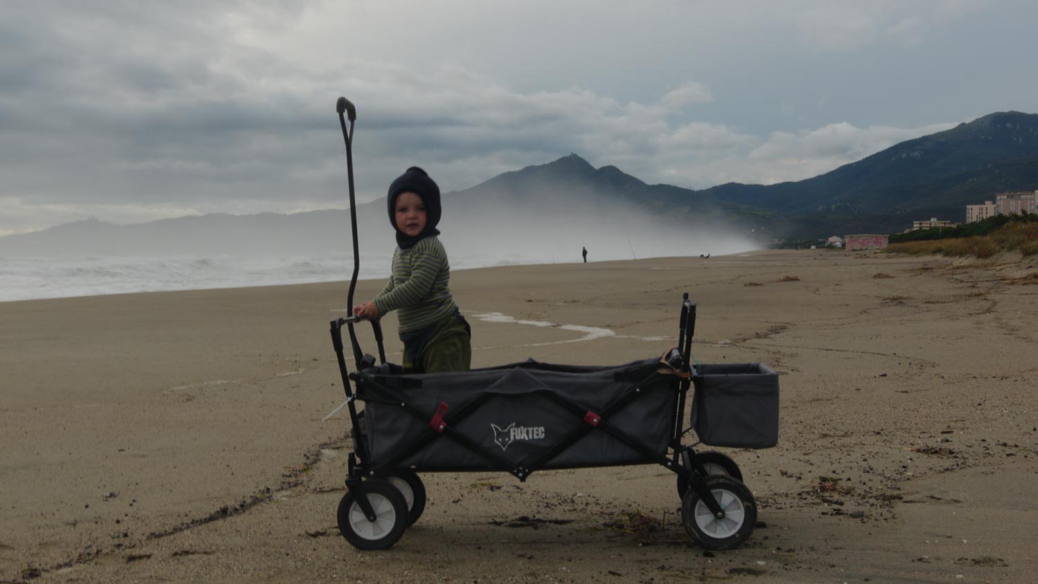 Der Plan: Wieder auf den Roussillonais, Paletten-Möbel bauen. Wir müssen eh die Zeit überbrücken bis Celina kommt. Die alleinerziehende Frau in den Bergen hinter Tarragona, bei der wir workawayen wollten, hat sich nicht mehr gemeldet. Es fängt an zu regnen. Wir kennen die Gegend zwischen Perpignan und Argelès mittlerweile ganz gut. Ich überschätze unsere Ortskenntnis und füttere das Navi nicht mit der genauen Adresse vom Campingplatz. Wir gurken auf seltsamen Straßen hin, aber sobald wir in Argelès Plage sind, wissen wir natürlich den Weg. Die Straße kurz vor der Einfahrt zum Campingplatz ist überschwemmt. Wo vorher der Parkplatz war, auf dem wir am allerersten Tag geparkt haben, um uns den Platz anzuschauen, ist jetzt Meer. Ein rotweißes Flatterband bewahrt die Wohnmobile davor, ins Wasser zu fahren. Hätten wir eh nicht gewagt. Es sieht richtig tief aus. Was nun. Ein Mann kommt an die Scheibe und sagt, dass es einen Hintereingang zum Campingplatz gibt. Wir kurven hin, zum Glück kennen wir uns in Argelès so gut aus. Tatsächlich, unbewachter Hintereingang, offen. Wir stellen uns diesmal ganz an den Zaun. Es ist leerer geworden. Das Wasser kommt bis fast an die Dünen. Die Wellen türmen sich meterhoch, tosen, gischten, die ganze Luft ist weiß. Es riecht nach Nordsee. Ich habe Angst um die Kinder, die am Strand toben, denke an Mareen.