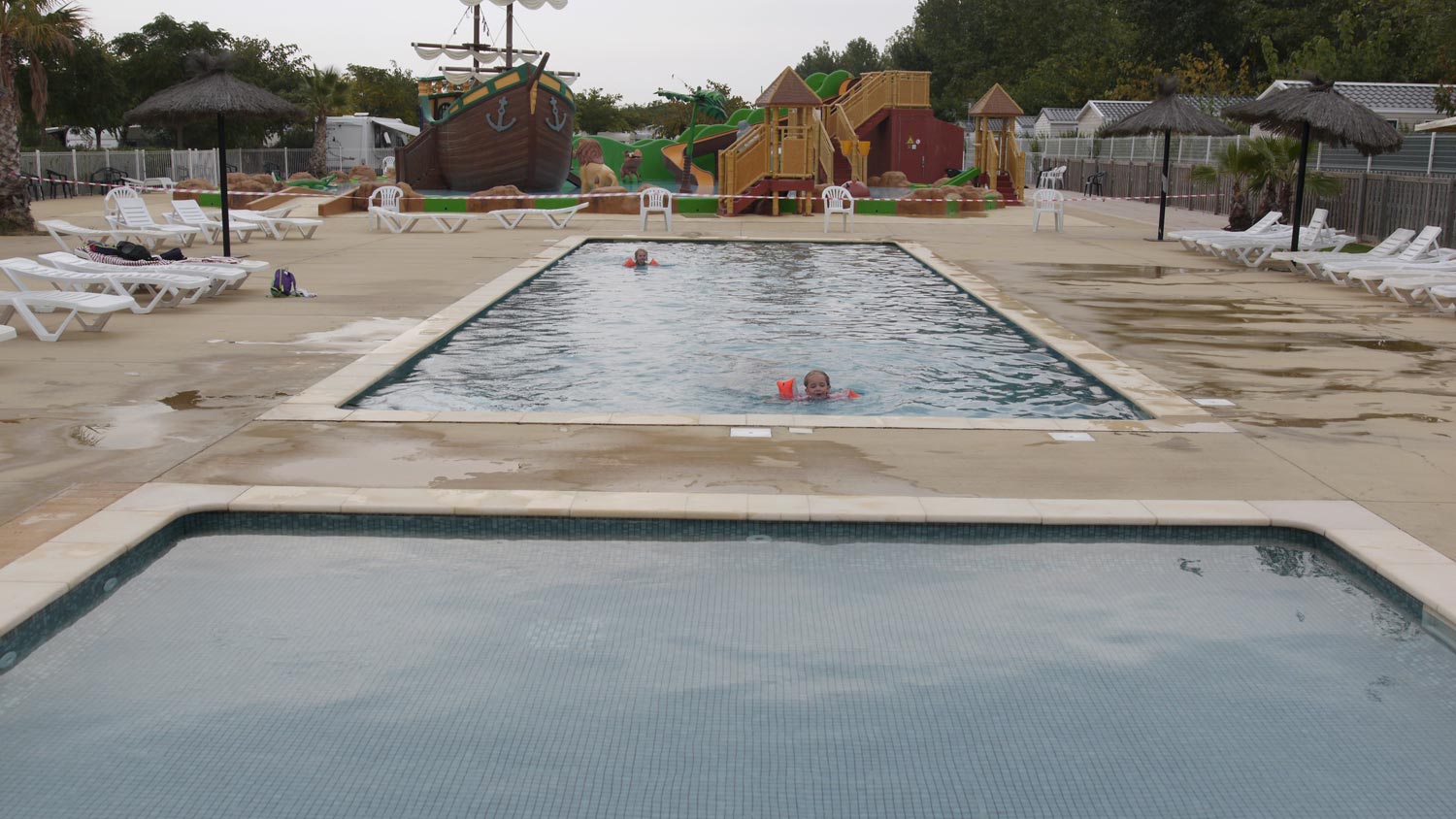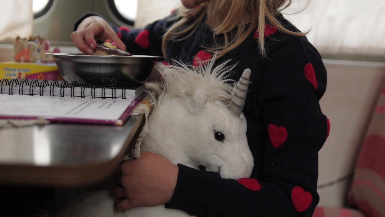 Tonis Geburtstag. Ich habe einen Nusskuchen aus dem Supermarkt mit Schokoglasur überzogen und mit Zuckertieren verziert. Kerzen. Das Herzchen-Kostüm. Das Einhorn. Das Kinderbecken rund ums Piratenschiff ist mit rot-weißem Flatterband abgesperrt. Ich frage einen Campingplatz-Menschen, ob das so bleibt. Er sagt, dass eine Jugendgruppe erwartet werde, bildet mit abgespreiztem Daumen und kleinem Finger eine imaginäre Flasche, die er zum Mund führt. Die zugelöteten Jugendlichen würden sonst auf den Mast klettern und könnten ins kaum knietiefe Wasser stürzen. Aber wir dürften natürlich rein. Er stellt für uns die Wasserspiele an. Volker planscht lange mit den Kindern im tiefen Pool, das Wasser ist viel wärmer als im Kinderbecken. Toni schwimmt ohne Schwimmflügel ein paar Züge bevor sie untergluckert.